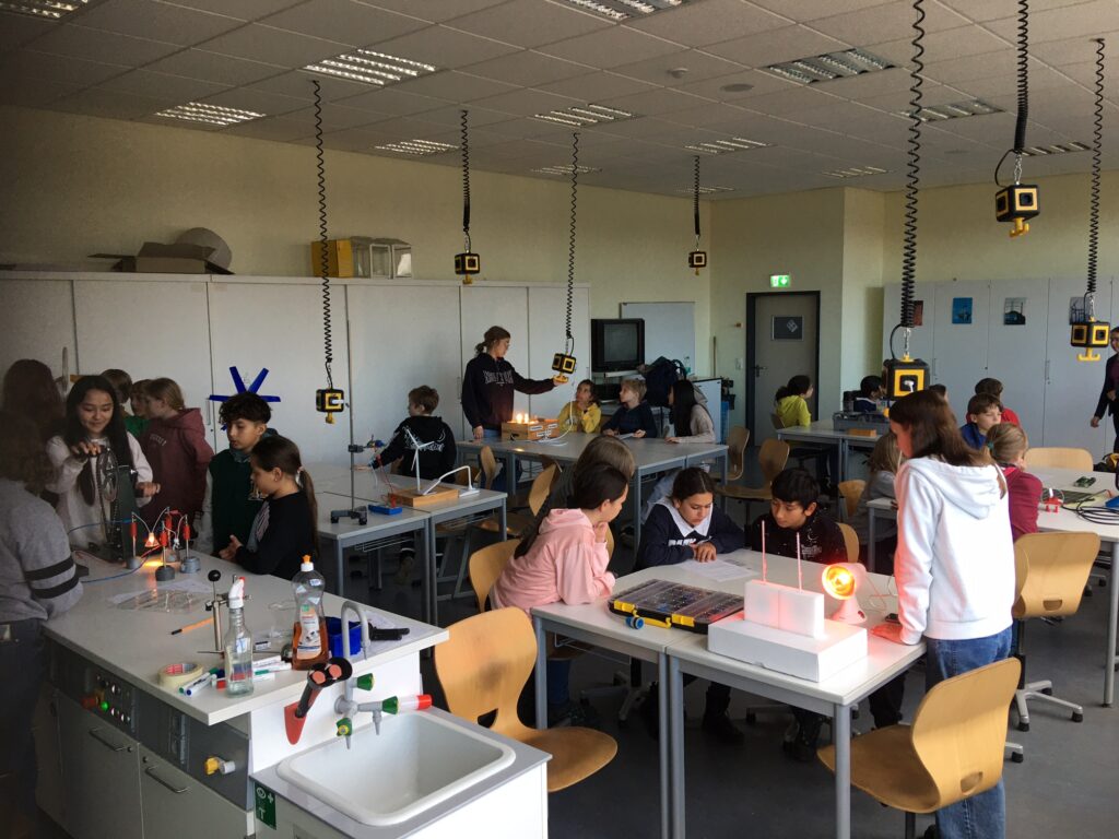 Mit dem Schwung aus den Herbstferien durchliefen heute die 5. Klassen nacheinander den alljährlich stattfindenden Energieparcours. In dem von den Schülerinnen und Schülern der Energie-AG aufgebauten und durchgeführten Stationenlernen konnten unsere Jüngsten rund ums Thema Energie experimentieren und Arbeitsblätter ausfüllen. Und da waren alle mit Feuereifer dabei – immerhin winkt als Siegerprämie für die beste