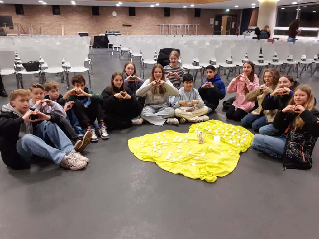 Bei der Aktion Friedenslicht am 10.11.2023 erinnerten wir uns an die Ereignisse vor 85 Jahren. Wir betrachteten Fotos von den brennenden Synagogen, geplünderten Geschäften und verhafteten Männern, die zuerst in „Schutzhaft“ genommen und dann in Konzentrationslager gebracht wurden – auch in Oldenburg. Zehn Namen von Schülerinnen, die als jüdisch deklariert wurden und 1933 die Cäci