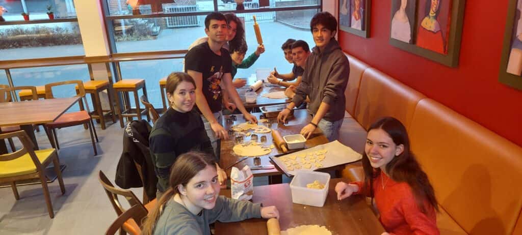 Wer sagt, dass man Kekse nur in der Weihnachtszeit backen und essen mag? Eben! Unsere Gastschülerinnen und Gastschüler sehen das offensichtlich genauso und verlebten gestern einen schönen Nachmittag mit Frau Lüttke und Petra in der Cäciteria. Drinnen war es warm, hell, freundlich und alles duftete wunderbar, während es draußen dunkelte, immer wieder fieselte, regnete oder