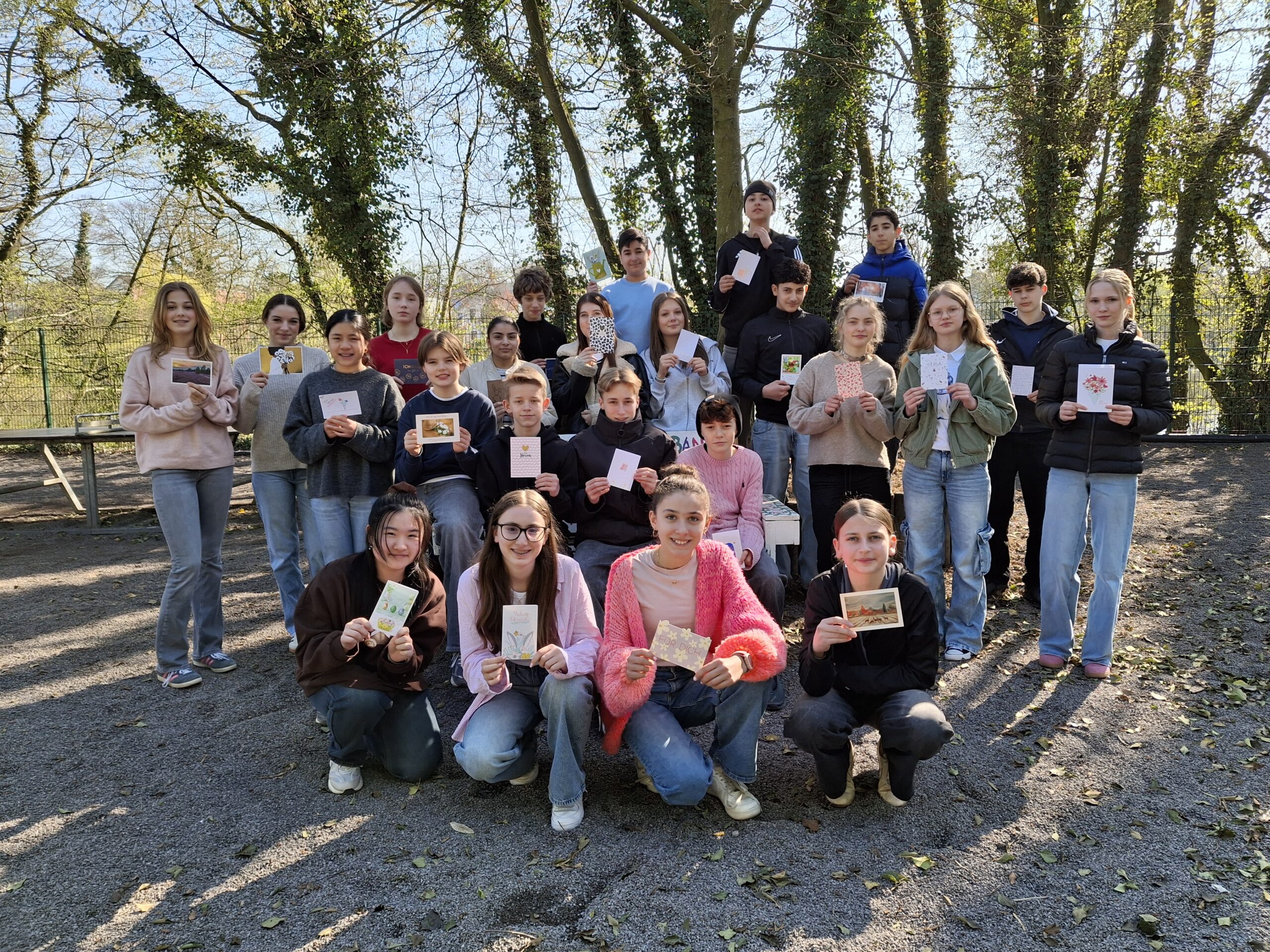 Die Klasse 8c gestaltet Ostereier der ganz besonderen Art – frei von Zucker und Schokolade, absolut allergikergeeignet und trotzdem mit starker Wirkung! Die Schülerinnen und Schüler haben Briefe und Karten an ein Seniorenpflegeheim in Hanau geschrieben und Frühlings- und Ostergrüße verschickt. Warum ausgerechnet an diese Einrichtung? Weil die Aktion „Post mit Herz“ uns genau dieses Pflegeheim als Adressat genannt hatte. Die Klasse nimmt bereits zum dritten Mal an dieser Aktion teil, die zur Oster- und Weihnachtszeit Menschen in pflegenden Einrichtungen eine Freude machen möchte, die wenig Zuwendung von Freunden oder Famillie bekommen können.