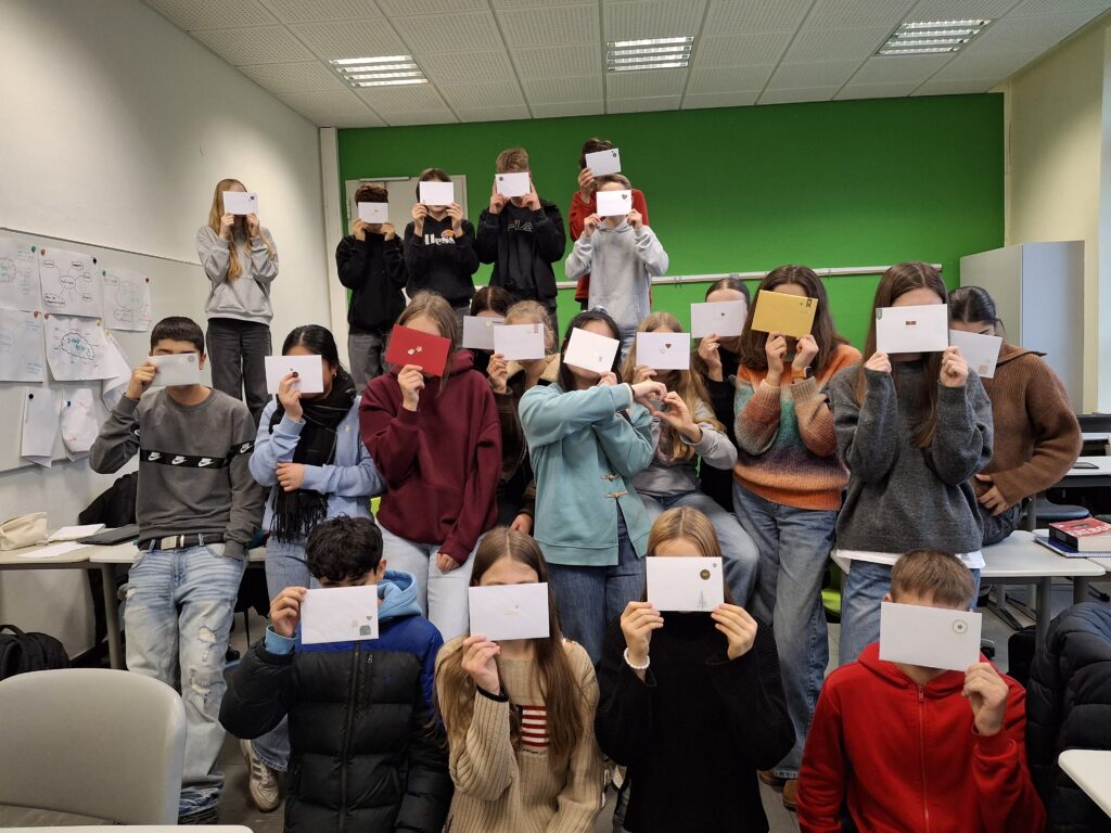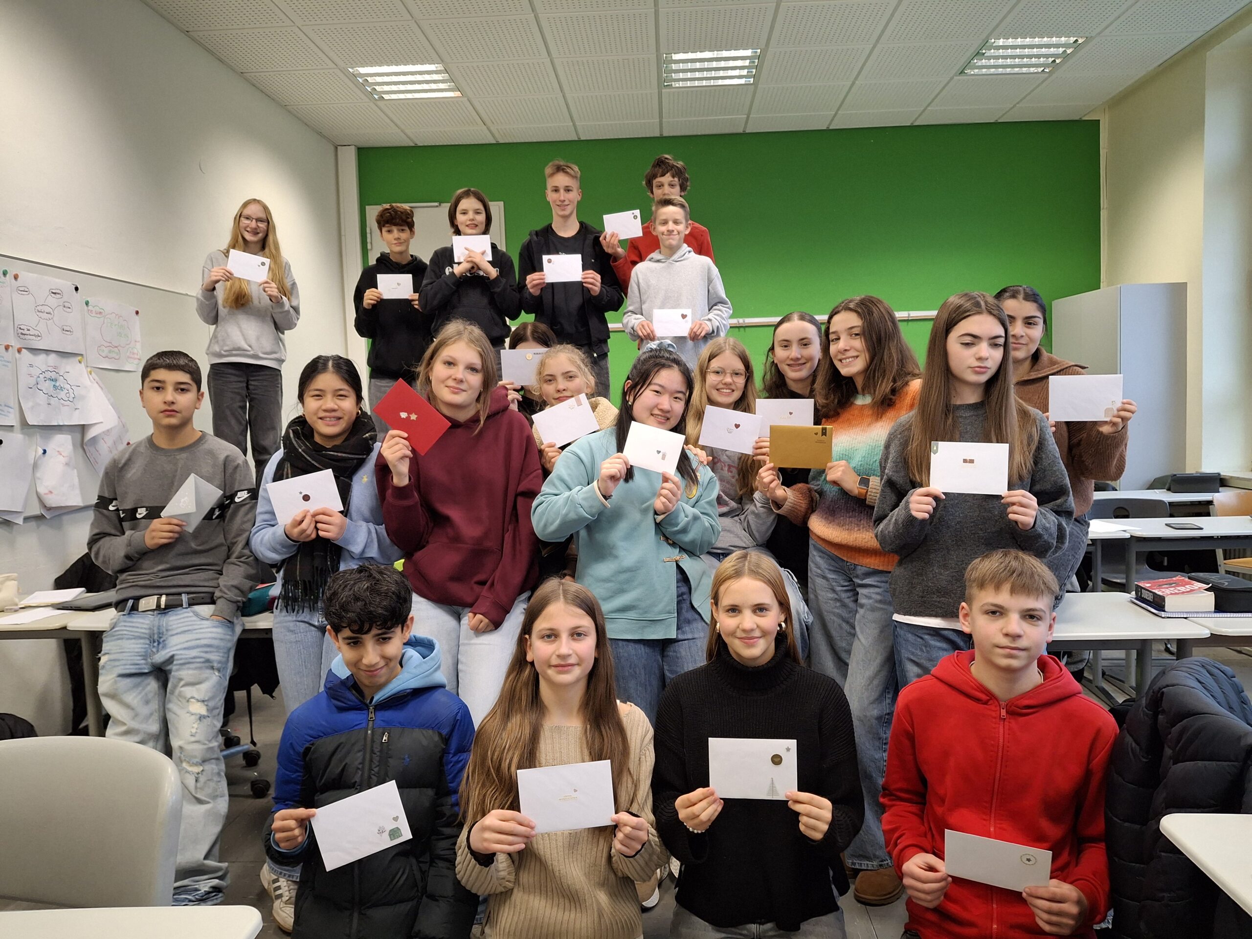 Die Briefkästen füllen in diesen Tagen wieder mit analoger und digitaler Weihnachtspost, einige Leute sammeln die eintrudelnden Weihnachtskarten aufgereiht am Kamin, auf dem Regal oder der Fensterbank. Und einige Leute bekommen keine Post und haben kaum Kontakte. Die Aktion „Post mit Herz“ ruft zum Gestalten und Schreiben von Weihnachtskarten mit freundlichen Grüßen und Wünschen an Menschen auf, die Weihnachten alleine verbringen. Wie bereits zu Ostern in diesem Jahr schreibt die Klasse 8c auch zu Weihnachten wieder Karten, insgesamt werden es 35 sein, die an eine Pflegeeinrichtung in Lübeck geschickt werden. So wurde heute im Deutschunterricht sehr oft in Schönschrift (!) „Frohe Weihnachten“ geschrieben, und auch die Briefumschläge wurden passend schön dekoriert.