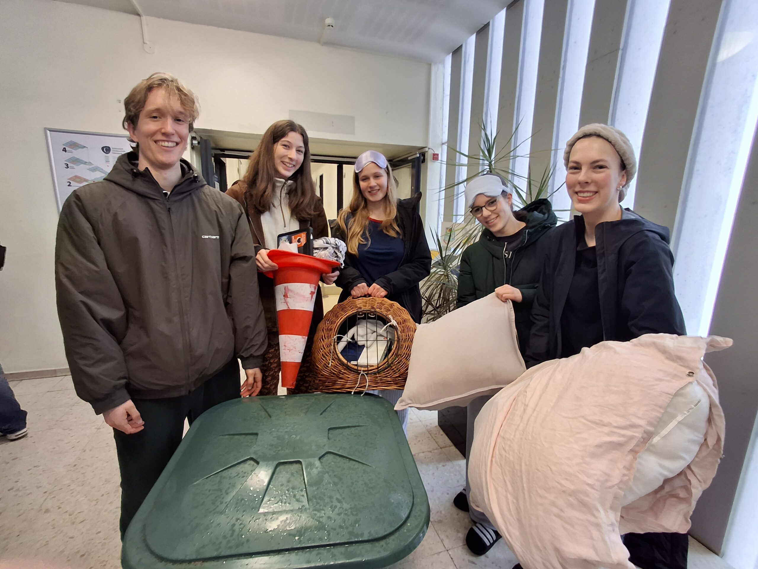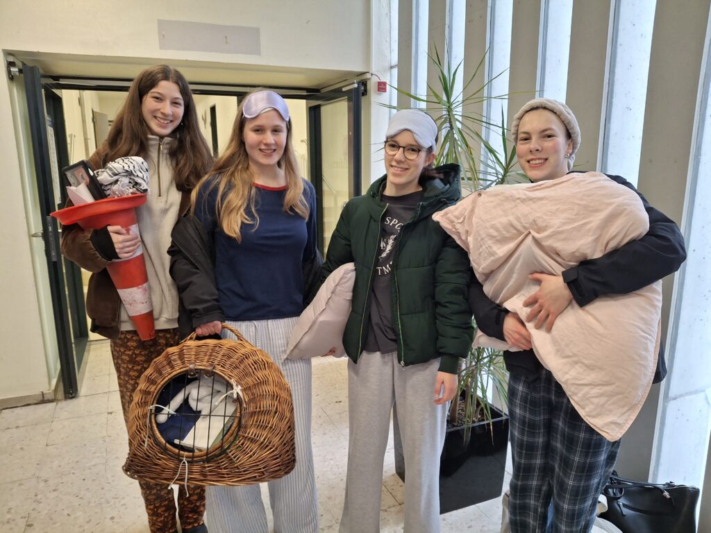 Die Mottowoche beginnt ja am Dienstag, aber irgendwie war unsere Q2 heute Morgen offensichtlich so spät dran, dass quasi alle im Schlafanzug kommen mussten und die nötigen Schulsachen nur noch in „anything but a bag“ packen konnten. Darum waren hier Vogelbauer, Katzenkörbe, Mülltonnen, Einkaufswagen und sogar eine Mikrowelle zu entdecken. Ich sage da nur „6 – 7!“