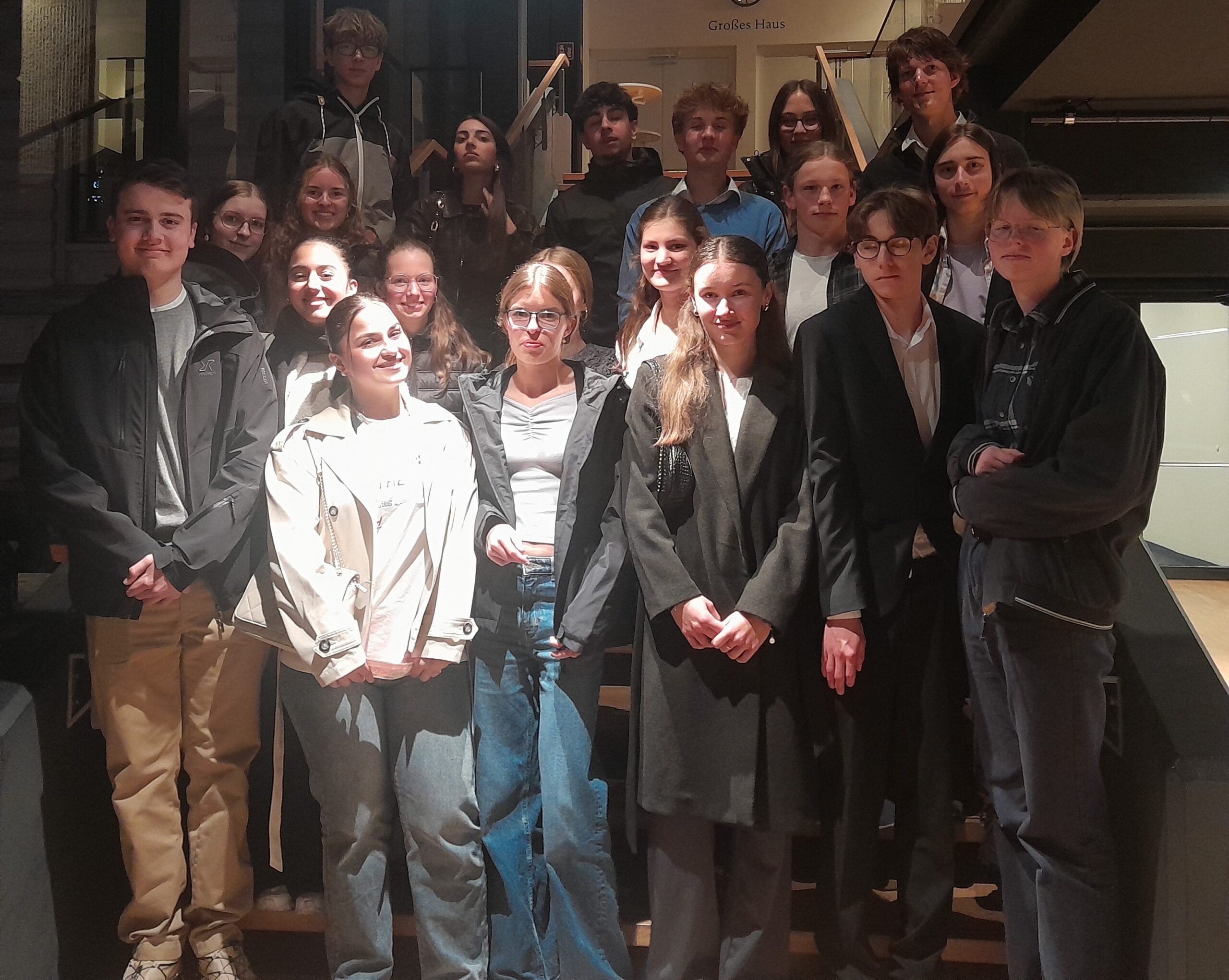Am 6. Mai besuchte die Klasse 11c eine Aufführung des Theaterstücks „Farm der Tiere“ nach George Orwell im Oldenburgischen Staatstheater. Das 1945 erschienene Stück hat auch bis heute nichts von seiner Brisanz verloren. Die Schülerinnen und Schüler sahen eine zeitgemäße und fesselnde Interpretation der Geschichte um die Revolution der „Tiere“ für eine bessere Zukunft, in der Schauspiel und Puppenspiel nahezu fließend ineinander übergingen, so dass am Ende Mensch und Tier fast gar nicht mehr voneinander zu unterscheiden waren.