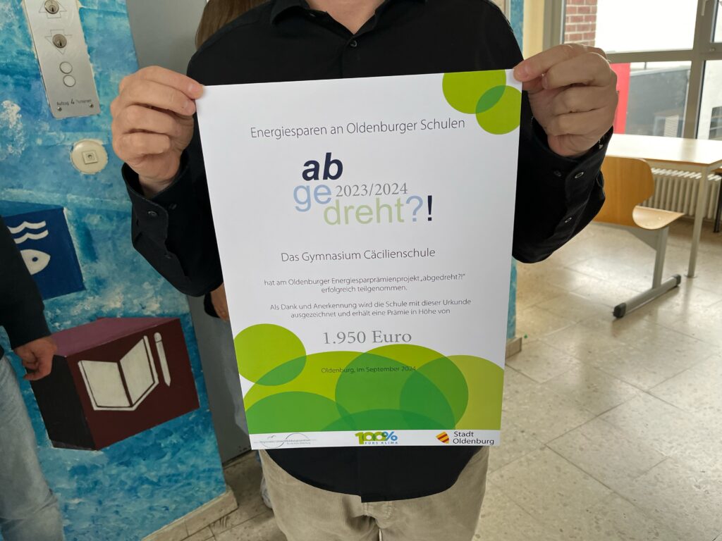 Wie in jedem Jahr erhielt die Cäcilienschule auch 2024 wieder die mit einer Urkunde und einem respektablen Geldbetrag verbundene Auszeichnung im abgedreht-Projekt der Stadt Oldenburg. Bei diesem Projekt werden nicht nur Aktivitäten der Energie-AG oder Exkursionen zu außerschulischen Lernorten zum Thema Nachhaltigkeit honoriert, sondern auch ganz konkrete Energiesparmaßnahmen belohnt. Die Energie-AG bekam als kleine Anerkennung vom Schulleiter persönlich die neue Dachkonstruktion der Schule präsentiert und informierte sich über die Möglichkeiten einer erweiterten Solaranlage.