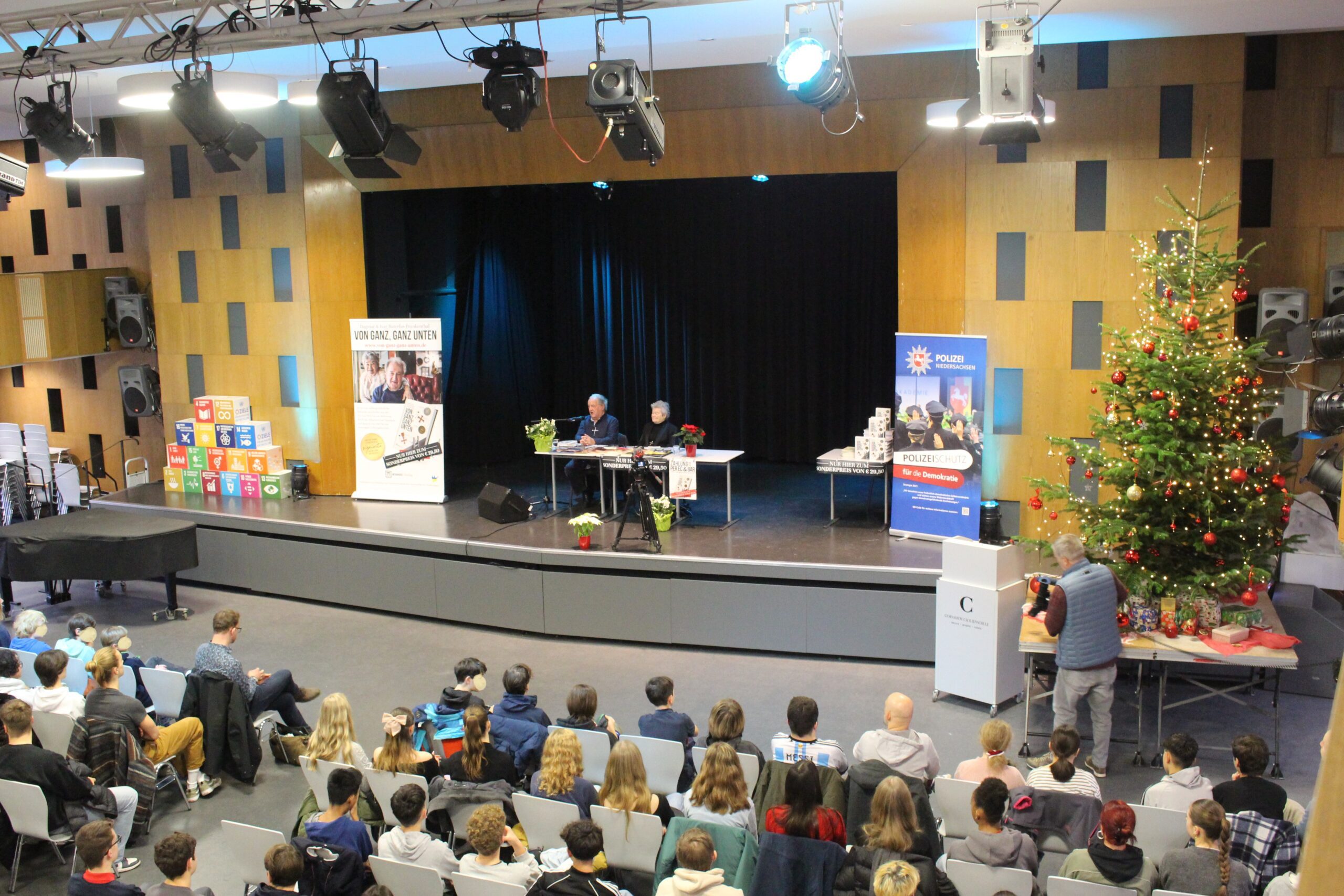 Sein großes Ziel ist es, anhand seiner Lebensgeschichte vor Antisemitismus und Rechtsextremismus zu warnen, den er in seiner schlimmsten Ausprägung als Kind in der NS-Zeit erleben muss. Wie bereits vor einem Jahr war der Holocaust-Überlebende Ivar Buterfas-Frankenthal mit seiner Frau zu Gast in der Aula der Cäci und sprach vor insgesamt etwa 500 Schülerinnen und Schülern, der Großteil davon von der Helene-Lange-Schule, die das Ehepaar eingeladen hatte und mit der Cäci zusammenarbeitete.