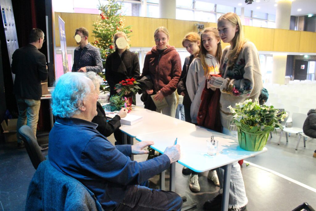 Nach seinem Vortrag ermutigte Buterfas-Frankenthal seine Zuhörerschaft zu Fragen und verdeutlichte sehr klar die Chance dieser Situation: „Fragt jetzt, nach mir kommt keiner mehr.“ Tatsächlich könnten die jetzigen Klassen 10 der Cäci, die an der Veranstaltung teilnehmen konnten, quasi die letzten unserer Schülerinnen und Schüler sein, die einen Holocaust-Überlebenden und Zeitzeugen persönlich erlebt haben. Waren in früheren Jahren beispielsweise Erna de Vries und „Hitlerjunge Salomo“ Sally Perel in der Cäci zu Gast und hinterließen mit ihren Erlebnissen bei den Jugendlichen einen tiefen Eindruck, so sind diese beiden mahnenden Stimmen mittlerweile verstummt: Erna de Vries verstarb bereits 2021, Sally Perel im Februar 2023. Um es nicht zu einem endgültigen Abschied werden zu lassen, denken wir uns in sprachlicher Anlehnung an den Wunsch „Nächstes Jahr in Jerusalem!“, wie es zum Schluss des jüdischen Seder-Abends heißt, hoffentlich noch einmal „Nächstes Jahr in Oldenburg!“.
