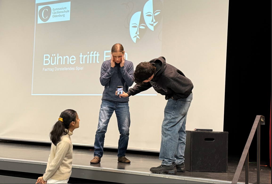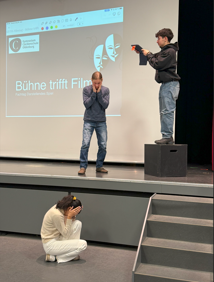 Welche Möglichkeiten gibt es, Film und Theater zu kombinieren? Welche Wirkung haben verschiedene Kameraperspektiven und Einstellungsgrößen? Wie produziere und inszeniere ich einen kurzen Film von der Entwicklung der Storyline über den Dreh, Schnitt, den Einsatz von Musik und Geräuschen bis hin zur Einbettung in die Bühnenhandlung? Und was kann alles in einem tiefen Brunnen passieren? Mit all diesen Fragen beschäftigten sich die Darstellendes-Spiel-Kurse des 11. Jahrgangs vor allem praktisch und sehr kreativ am Fachtag Darstellendes Spiel in der letzten Woche.