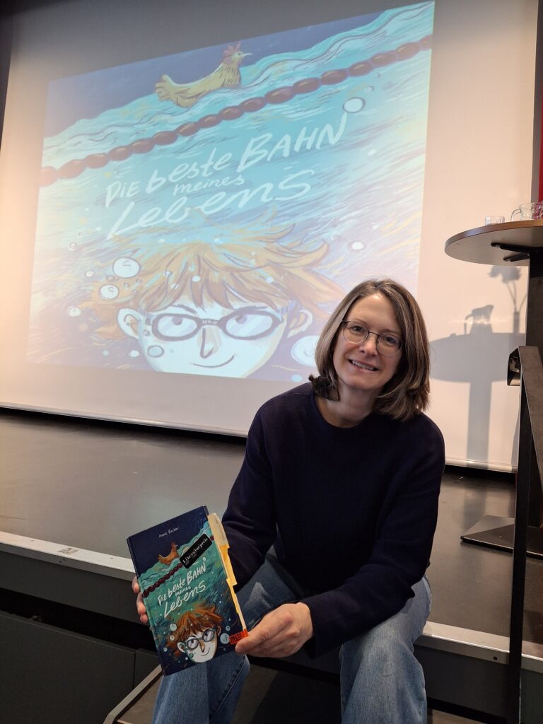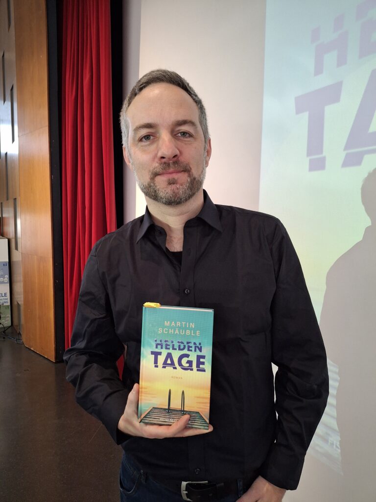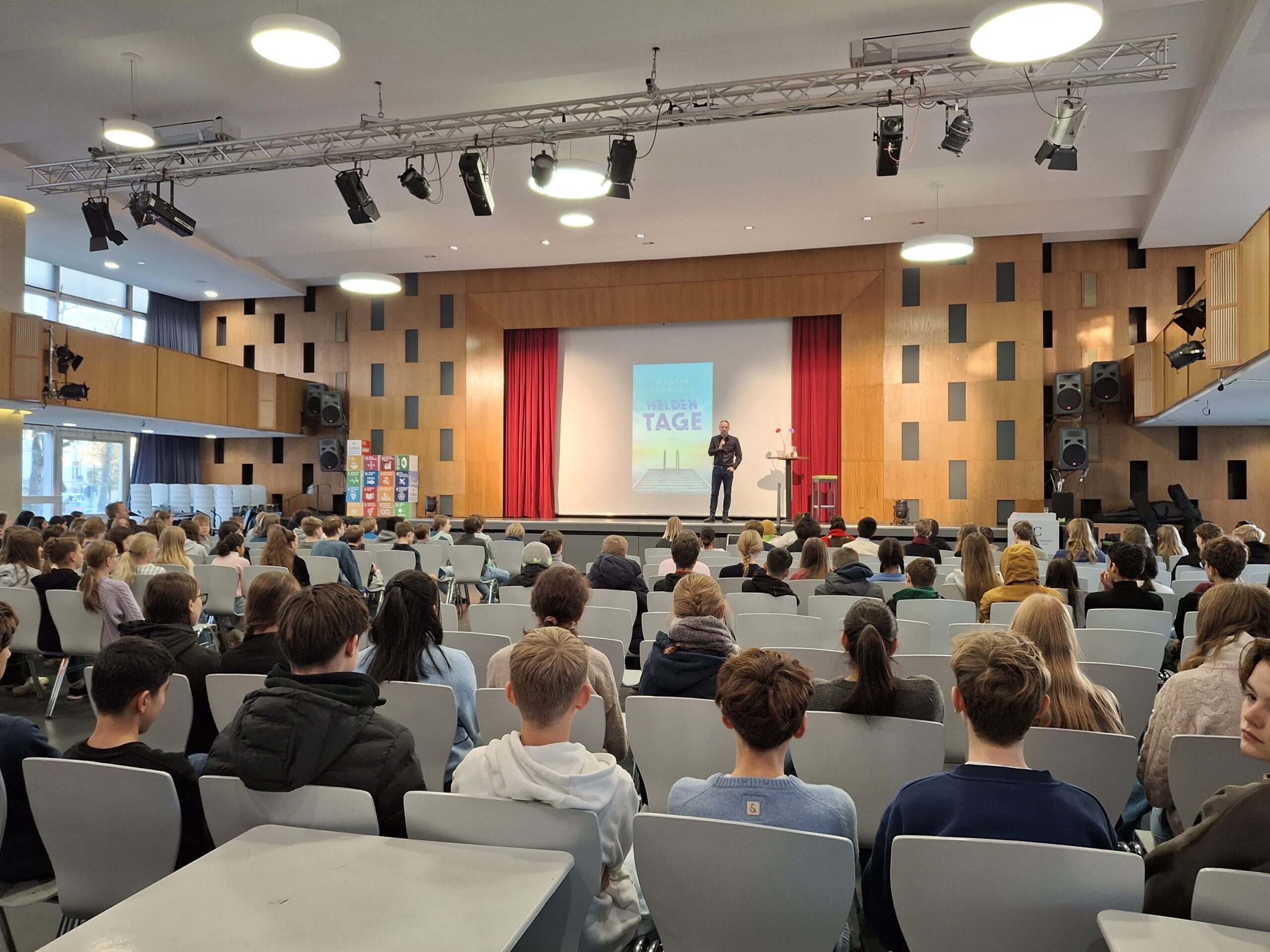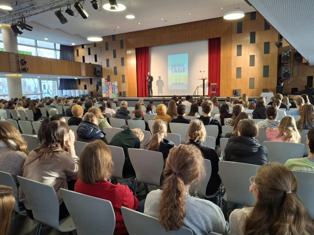 … und auch umgekehrt, KIBUM goes Cäci, denn am Freitag war KIBUM-Tag in der Cäci! Wir konnten gleich zwei Lesungen für unsere Schülerinnen und Schüler gewinnen, und so hatten zuerst die Jahrgänge 7 bis 9 die Gelegenheit, Martin Schäuble zu erleben, der nicht nur aus seinem Roman „Heldentage“ vorlas, sondern auch sehr anschaulich von dieser Geschichte erzählte und die Zuhörerschaft auf eine Reise mitnahm. Im Anschluss daran war Anne Becker bei uns zu Gast, die den Klassen 5 und 6 von Jan und Flo erzählte, deren Geschichte sie in ihrem Roman „Die beste Bahn meines Lebens“ vorstellt.