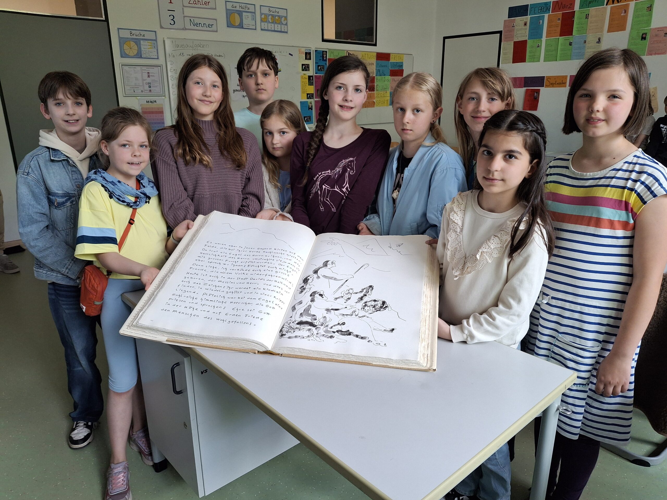 Dem Trend zum kleinen Buch oder gar E-Book, das man auf dem Reader oder Handy liest, kann dieses Buch wahrlich nicht folgen (und will es auch gar nicht), und das fiel auch den Schülerinnen und Schülern aus dem Religionskurs von Frau Goldbach in Jahrgang 5 auf. „Ist das schwer?“ (ja, ziemlich!), „Was ist das für ein Papier?“ oder „Was steht denn da drin?“ Erst mit der letzten Frage waren sie beim Inhalt angekommen, vorher hatte bereits das Äußere des Buches „Bilder des Heils“ von Heinrich Gerhard Bücker sie so fasziniert. Die „Bücker-Bibel“ mit großformatigen Bildern und den Bibelübersetzungen von Martin Buber zog in den Bann, besonders auch der schlicht gestaltete, aber gewaltig wirkende Engel in der Weihnachtsgeschichte in Lukas 2., der mit seinem Flügelarm beeindruckend und gleichzeitig beschützend wirkt. Aufgrund einer freundlichen Leihgabe aus der Elternschaft konnten die Schülerinnen und Schüler diesen besonderen Eindruck von Bibelausgaben erhalten; schon vorher hatten sie über Ausgaben wie das Hosentaschen-NT der Gideons gestaunt. Wir danken ganz herzlich für diese Möglichkeit!