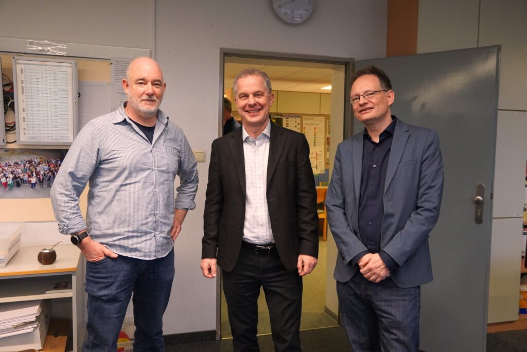 Am gestrigen Mittwoch haben wir unseren neuen Dezernenten Herrn Holger Wirtz und er die Cäci persönlich kennengelernt. Er kam zu Besuch in die Schule und hatte sich einen Tag ausgesucht, an dem sie geradezu vibrierte vor Aktion: In der rappelvoll mit mehr als 400 Grundschulkindern besetzten Aula gab es die zweite Vorstellung des selbstgeschriebenen und -komponierten Musicals „Der Teufel mit den drei goldenen Haaren“, in den Fluren traf man immer wieder auf fleißig arbeitende Schülerinnen und Schüler und sie betreuende Lehrkräfte, die AG Schulgeschichte arbeitete an einem Studientag sehr eigenständig und intensiv an ihren Wettbewerbsbeiträgen weiter, aus der Sporthalle dröhtnen Musik und Rufe von den Ballsportarten – also war alles eigentlich wie immer.