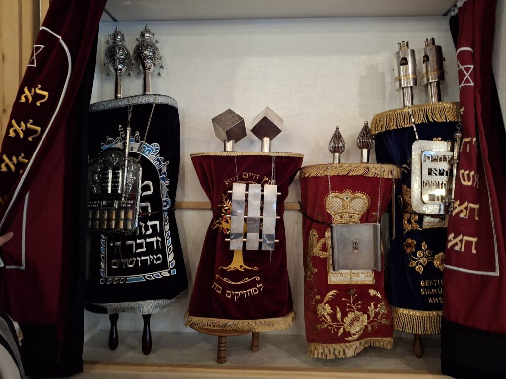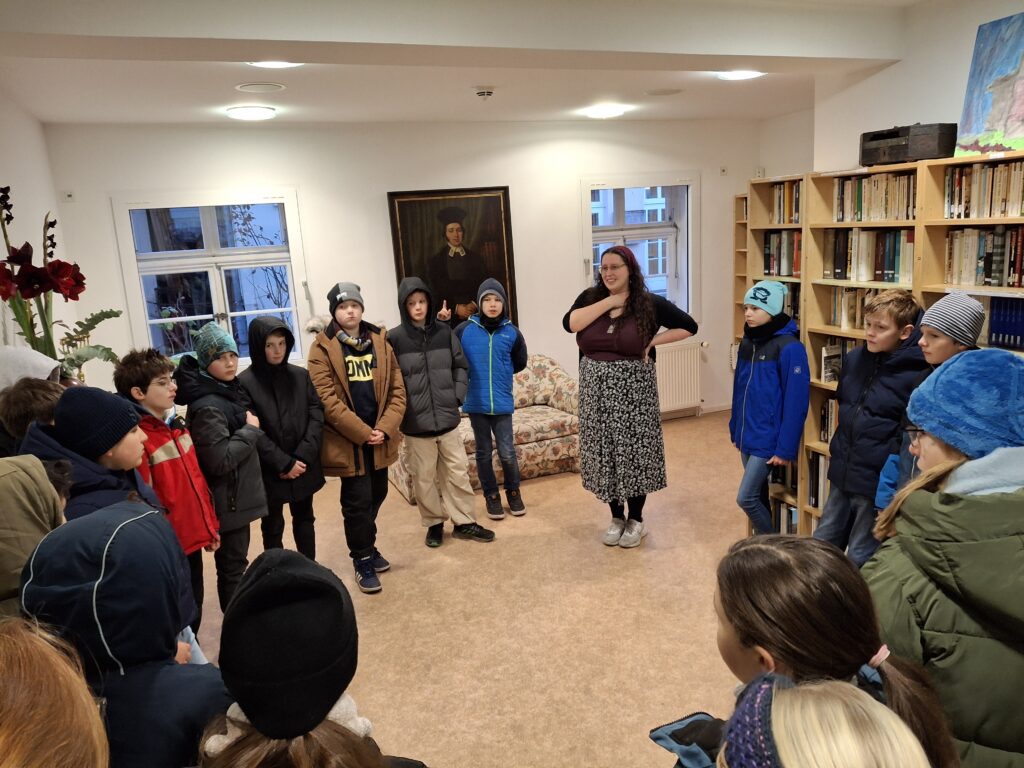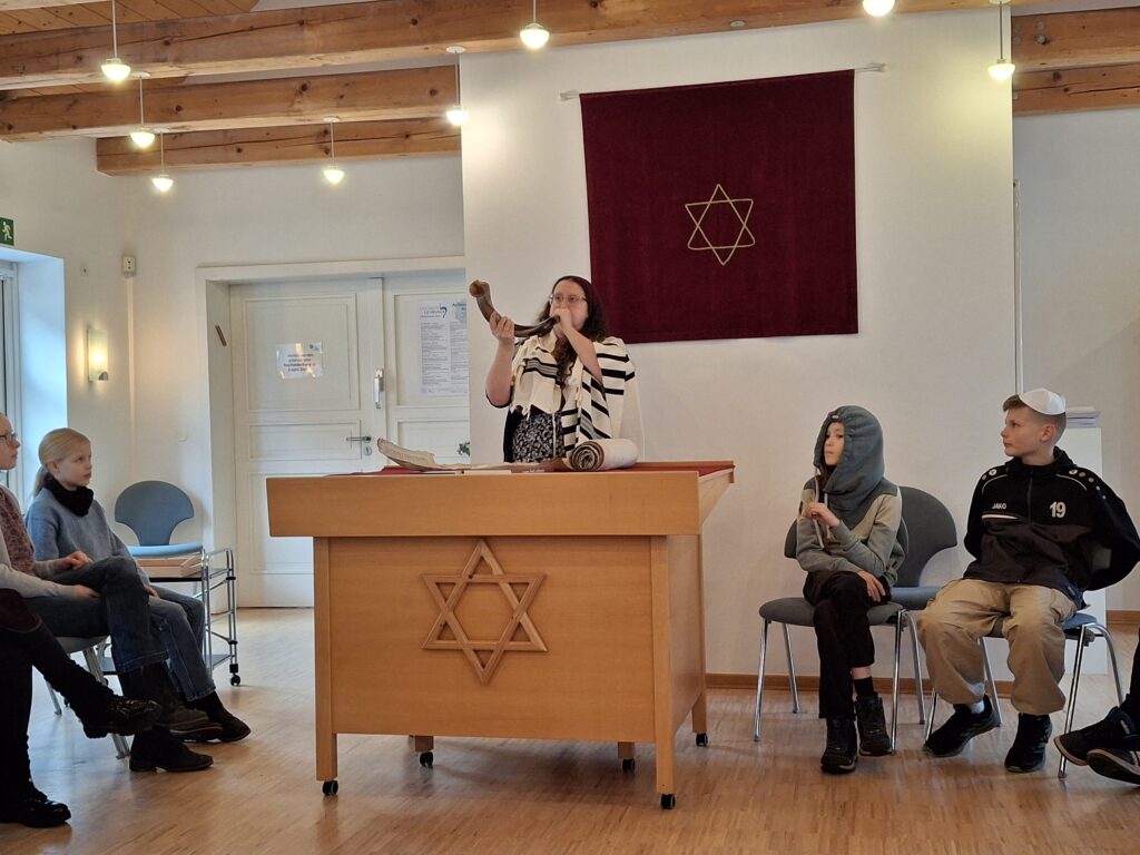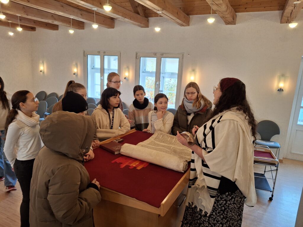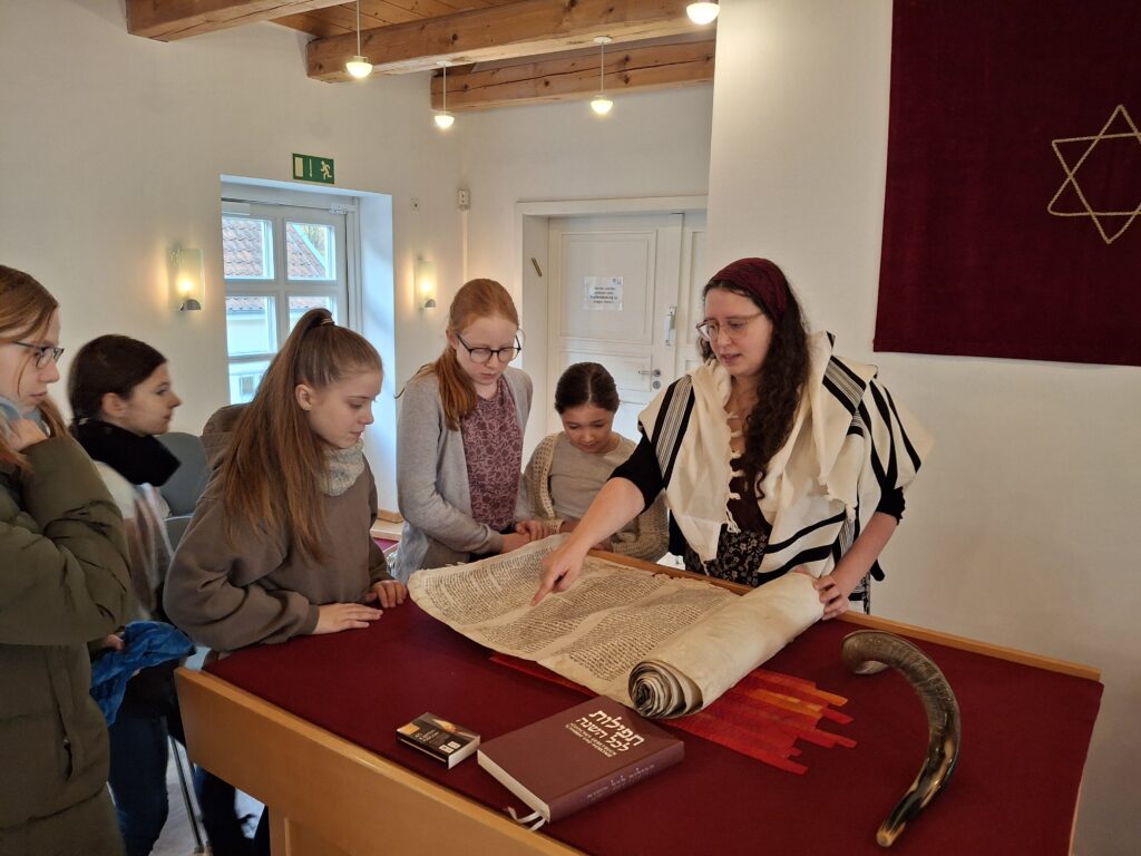 Was macht einen Raum zur Synagoge? Die Tora und die Gemeinde! So klare Antworten erhielten die Schülerinnen und Schüler aus dem Religionskurs Jahrgang 6 von Frau Goldbach heute bei einer Führung durch die Oldenburger Synagoge in der Leo-Trepp-Straße. Und der Aufforderung, sie dürften alle Fragen stellen, die ihnen in den Sinn kämen, kamen die Jugendlichen dann in der Tat eifrig nach und stellten sehr kluge Fragen zum Synagogenraum, zum Leben als jüdische Person in Oldenburg und Deutschland, zur Feier von Shabbat und Pessach und zur Geschichte der Gemeinde in Oldenburg. Ein ganz besonderer Moment war auch der, als der Toraschrein geöffnet und der Blick auf die prachtvoll geschmückten Torarollen frei wurde. Und als die Synagogenführerin einen Abschnitt aus der Tora vorgesungen hat. Und als die Schülerinnen und Schüler eine Torarolle, die nicht mehr verwendet werden kann, genauer ansehen und sogar berühren konnten. Und als das Schofar geblasen wurde. Und … – diese Aufzählung lässt sich noch weiter fortsetzen. Es war ein beeindruckender Besuch. Plötzlich war die Doppelstunde aber vorbei, und die Kinder und Frau Goldbach mussten in die Schule zurück, der reguläre Unterricht rief, doch dieser Unterrichtsgang wird nachwirken!