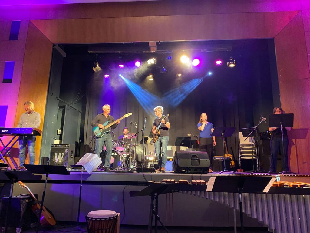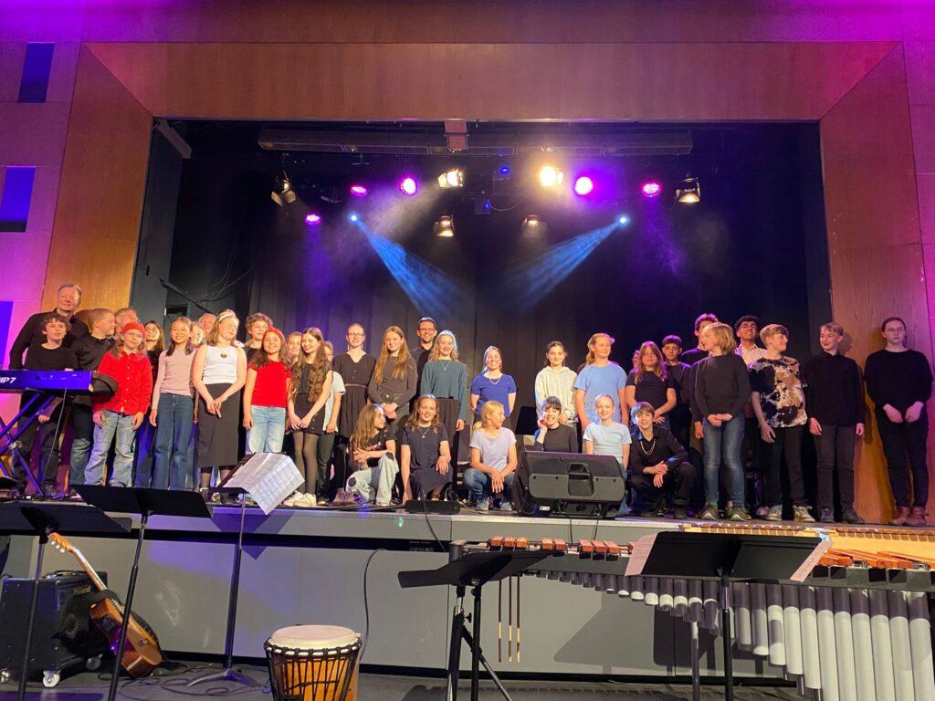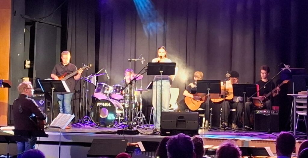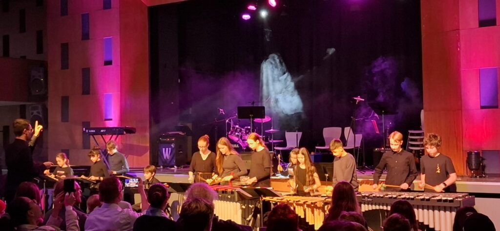 Musikalisch vielseitig gestaltete sich der Mittwochabend in der Aula. Kleiner Chor, Small-Band und Percussion-Band präsentierten ihre Stücke aus dem Schuljahr, darunter sogar ein gemeinsames Stück aus ‚König der Löwen‘, bei dem der Chor und die Percussion-Band fusionierten. Den Abschluss bildete die Lehrer:innen-Band sowie das obligatorische Eis von Petra für alle Mitwirkenden.