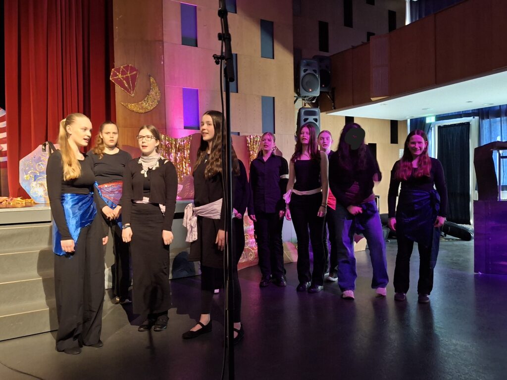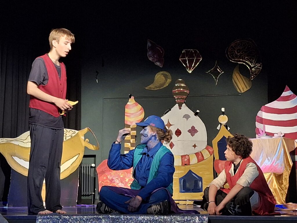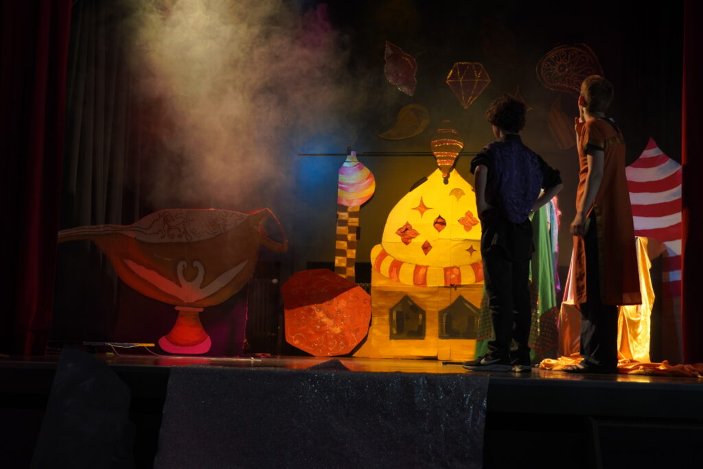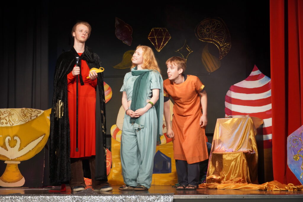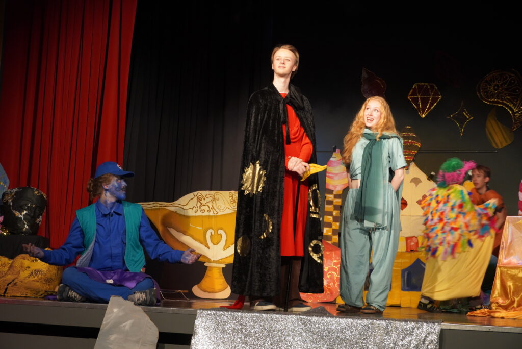 Doch es war nicht die English Theatre Group unter der Leitung von Frau Dr. Herzig-Danielson alleine, die uns als Publikum so verzaubert hat – der große Chor von Frau Hoppe und der Sologesang sind genauso zu erwähnen wie das magische Bühnenbild des Profilkurses Kunst unter der Leitung von Frau Janas, der es geschafft hat, die Cäci-Bühne in Oldenburg mit verschiedenen Farben und Stoffen in das orientalische Agrabah zu verwandeln und uns in die Zeit von 1001 Nacht zu entführen. Ergänzt wurden diese Effekte durch die engagierte Veranstaltungstechnik, denn „Beleuchtung“ beim Theater ist schließlich wesentlich mehr als nur „Licht an“ und „Licht aus“, sondern eine Kunst für sich.