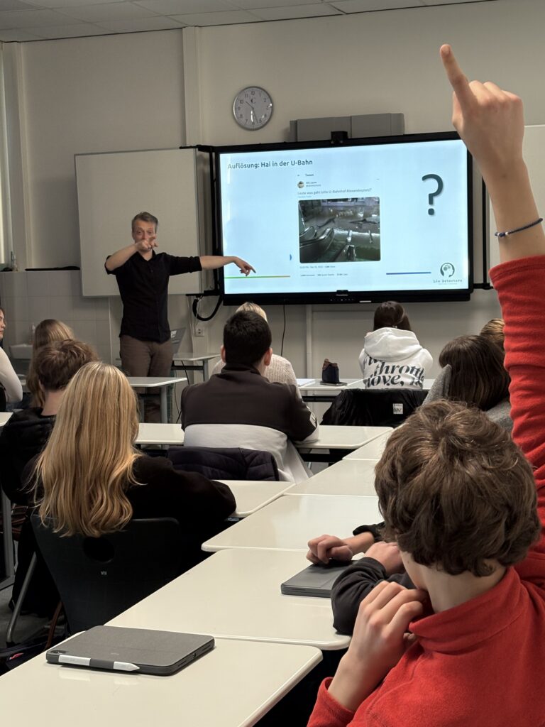 Im Rahmen der World-Press-Photo Ausstellung, die noch bis zum 15. März im Landesmuseum für Kunst und Kultur zu sehen ist, hat Initiator Claus Spitzer-Ewersmann die Lie Detectors mit einem Bildungsangebot zu Falschnachrichten und ethischem Journalismus nach Oldenburg geholt. Die Lie Detectors sind eine unabhängige Medienbildungsorganisation, die mit Hilfe der ehrenamtlichen Tätigkeit von Journalistinnen und Journalisten in Europa Schulungen unter anderem für Kinder, Jugendliche und Lehrkräfte durchführt. In diesem Jahr konnte die Cäci die beiden angebotenen Schulungen für sich gewinnen und so kam der Wissenschaftsjournalist Michael Stang, der unter anderem für den Deutschlandfunk tätig ist, in zwei neunte Klassen. Anhand von plastischen Beispielen erfuhren die Gruppen, wie man Falschmeldungen entlarven kann und stellten so fest, dass an der U-Bahnstation Berlin Alexanderplatz entgegen der Meldungen in Sozialen Netzen nie Haie geschwommen sind. Außerdem lernten die Neuntklässlerinnen und -klässler die Herausforderung journalistischer Arbeit unter Einhaltung der fünf Prinzipien ethischen Journalismus kennen.