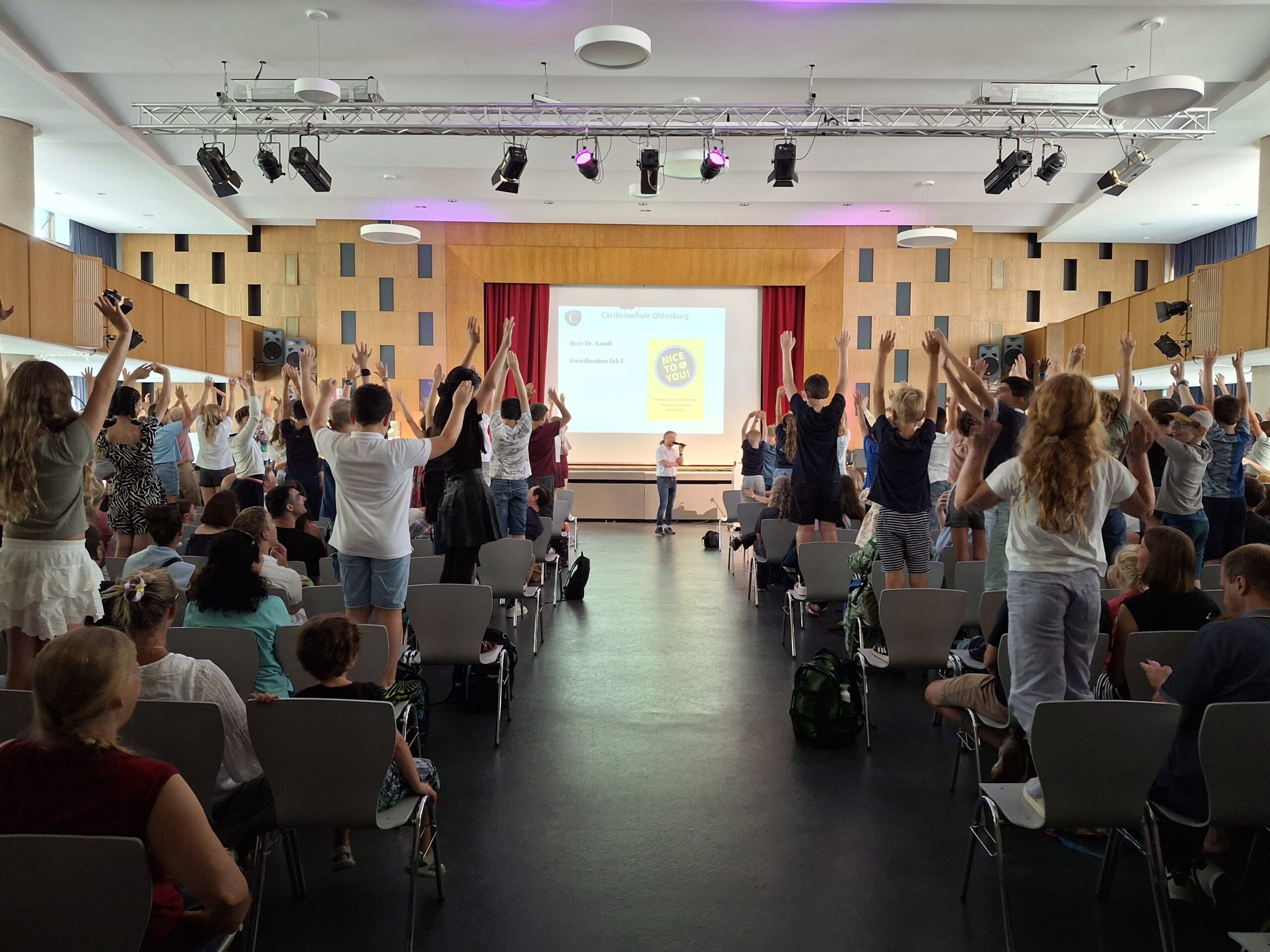 Für den neuen Jahrgang 5 begann heute das Abenteuer Gymnasium bei uns an der Cäci. Fast 150 neue Schülerinnen und Schüler konnte Herr Dr. Möller in der vollen Aula begrüßen unterstützt durch Herrn Dr. Kandt, das Salonorchester unter der Leitung von Herrn Dr. Syfuß, Petra und die AG Showturnen von Herrn Prieb, die alle wunderbar einstimmten. Herr Dr. Kandt als SekI-Koordinator nahm die Kinder und ihre Eltern dann mit auf eine Zeitreise in die Zukunft, indem unsere neuen „Kleinen“ zuerst aufstehen durften (so groß sind sie jetzt), dann die Arme heben (Größe Ende Klasse 10) und dann auf den Stuhl steigen durften, um zu verdeutlichen, welch eine große Entwicklung die Jungen und Mädchen in den nächsten neun Jahren durchlaufen werden. Auch wenn sie nicht die Körpergrößenmarke von 2m erreichen sollten.