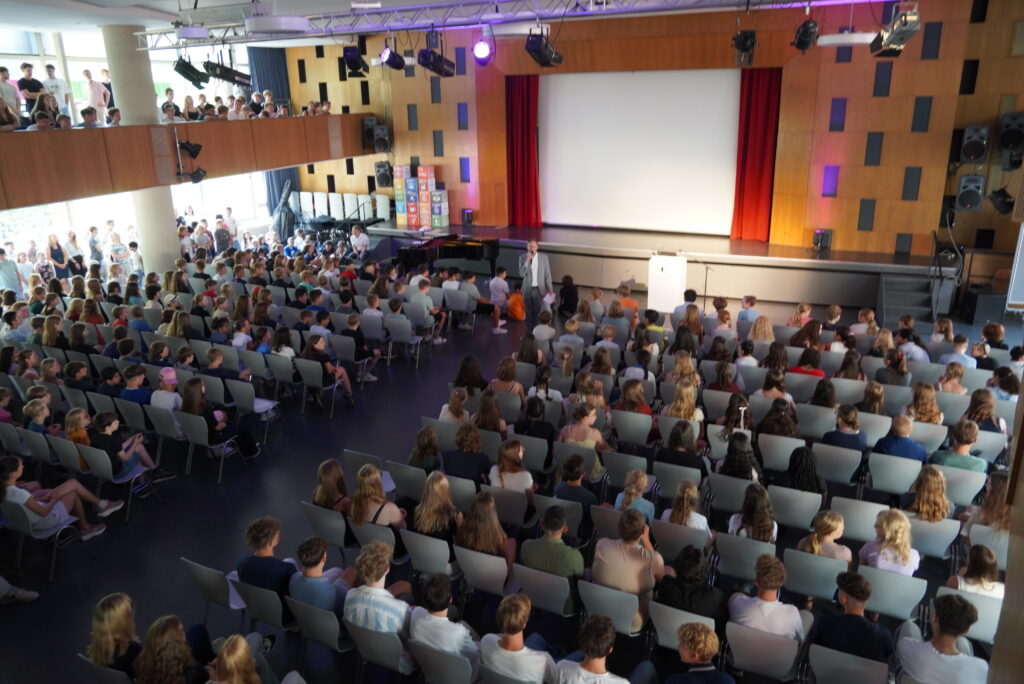 Tag 1 des neuen Schuljahres – für die Jahrgänge 6 bis 13 war es eine Rückkehr in vertraute Räume, zu vertrauten Gesichtern und Abläufen. Und dennoch Aufregung wegen all des Neuen, das auch sie im kommenden Schuljahr erwartet. Bestimmt ebenfalls ein bisschen aufgeregt waren die neuen Kolleginnen und Kollegen, die vor und von der Schulgemeinschaft begrüßt wurden.