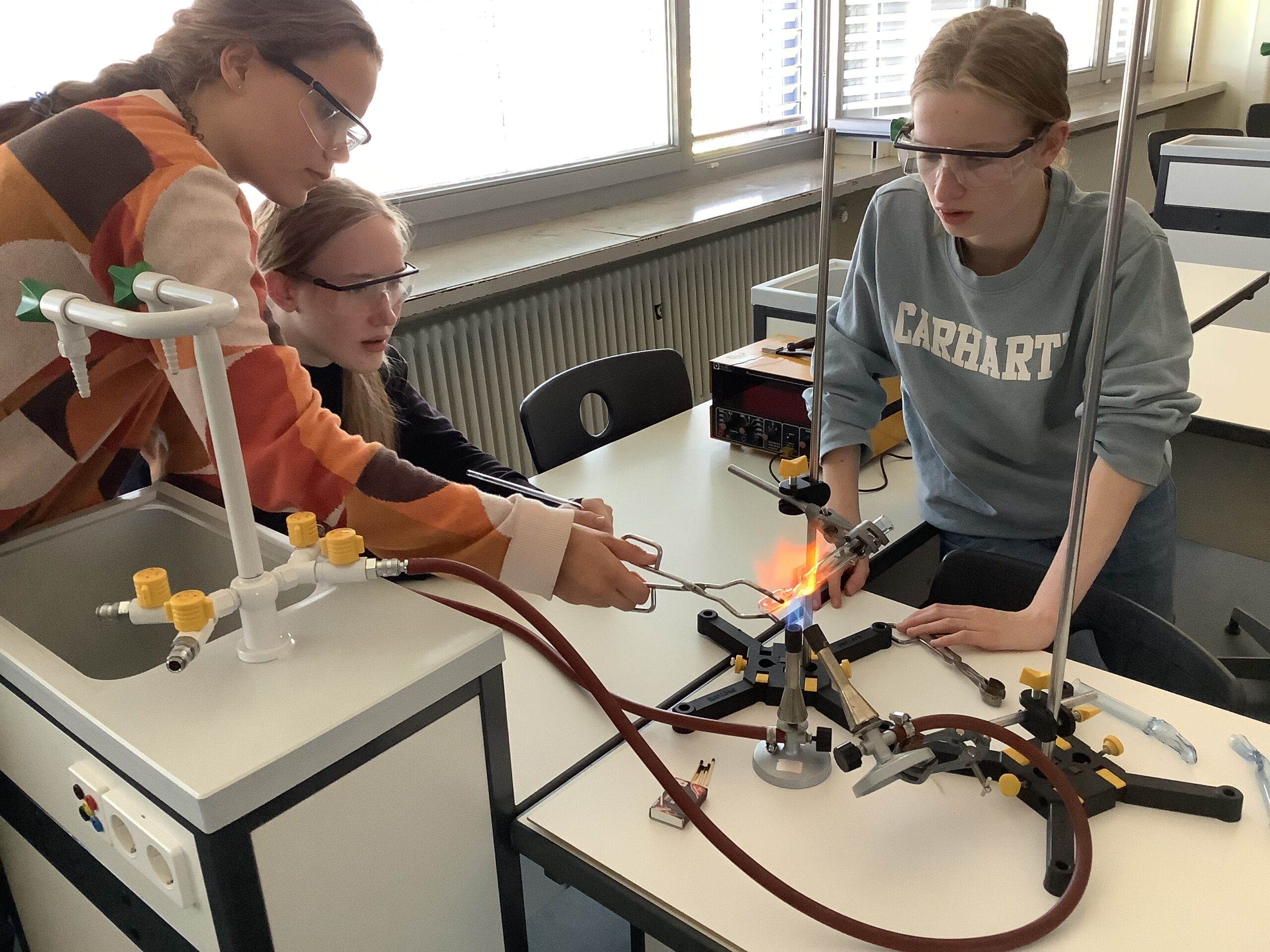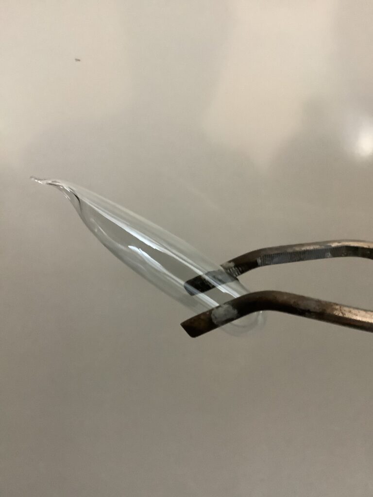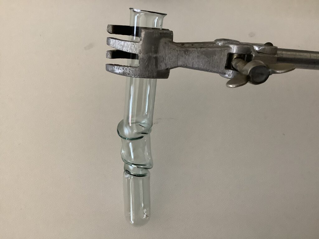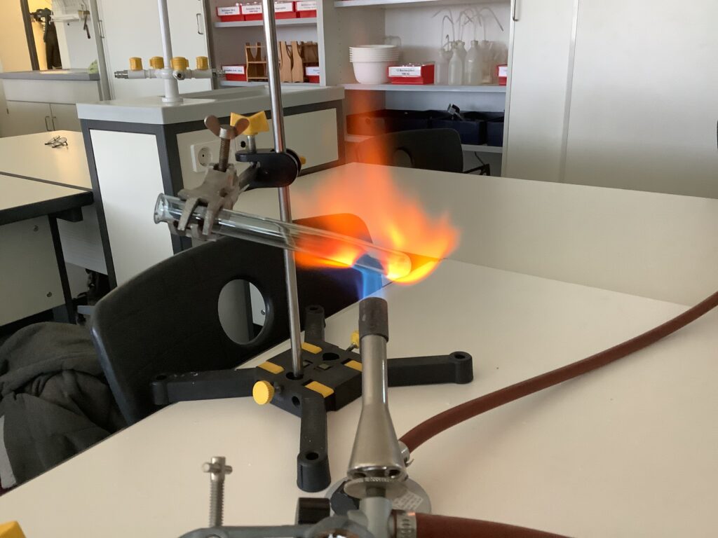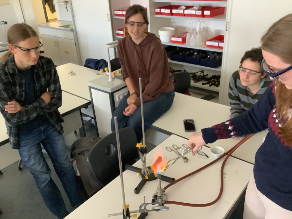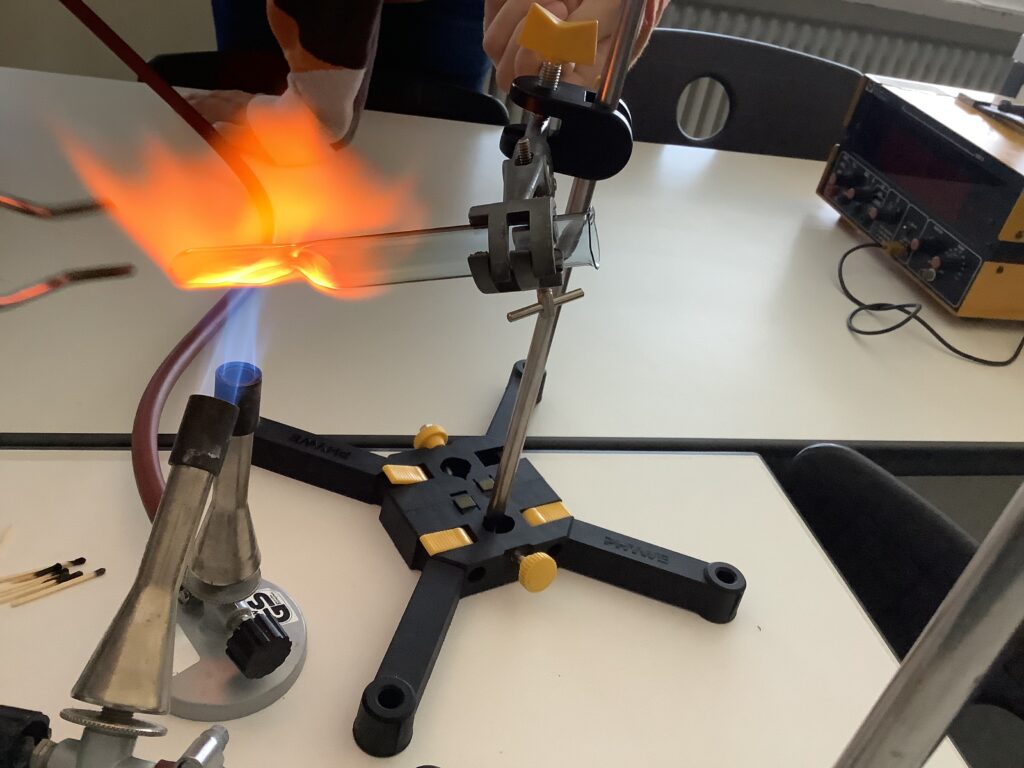 In der Chemie-AG bei Herrn Dr. Kandt wird Woche für Woche experimentell gearbeitet, immer offen für die Ideen und Vorschläge der Schülerinnen und Schülern. Dieses Mal unternahmen die AG-Teilnehmerinnen und -Teilnehmer den Versuch, Glas zu schmelzen und zu formen. Kurzerhand wurden zwei Gasbrenner aufgebaut und beide Flammen zu einer besonders heißen vereinigt. Und siehe da, die sonst so stabilen Reagenzgläser begannen zu glühen und wurden weich. Erste Ergebnisse dieser plastischen Versuche sind auf den Fotos zu sehen.