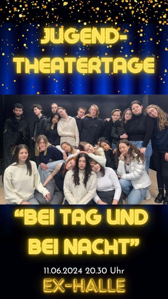 Am Samstag sind die Jugendtheatertage feierlich eröffnet worden und der DS-Kurs von Frau Burchards wurde eingeladen, sein selbst entwickeltes Stück „BEI TAG UND BEI NACHT – Wovon träumen wir?“ zu zeigen. Die Collage aus Tanzchoreografien, autobiografischen Texten, Interviews und Szenen ist zu sehen am 11. Juni 2024 um 20.30 Uhr in der Ex-Halle.