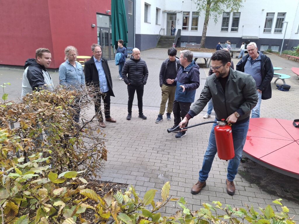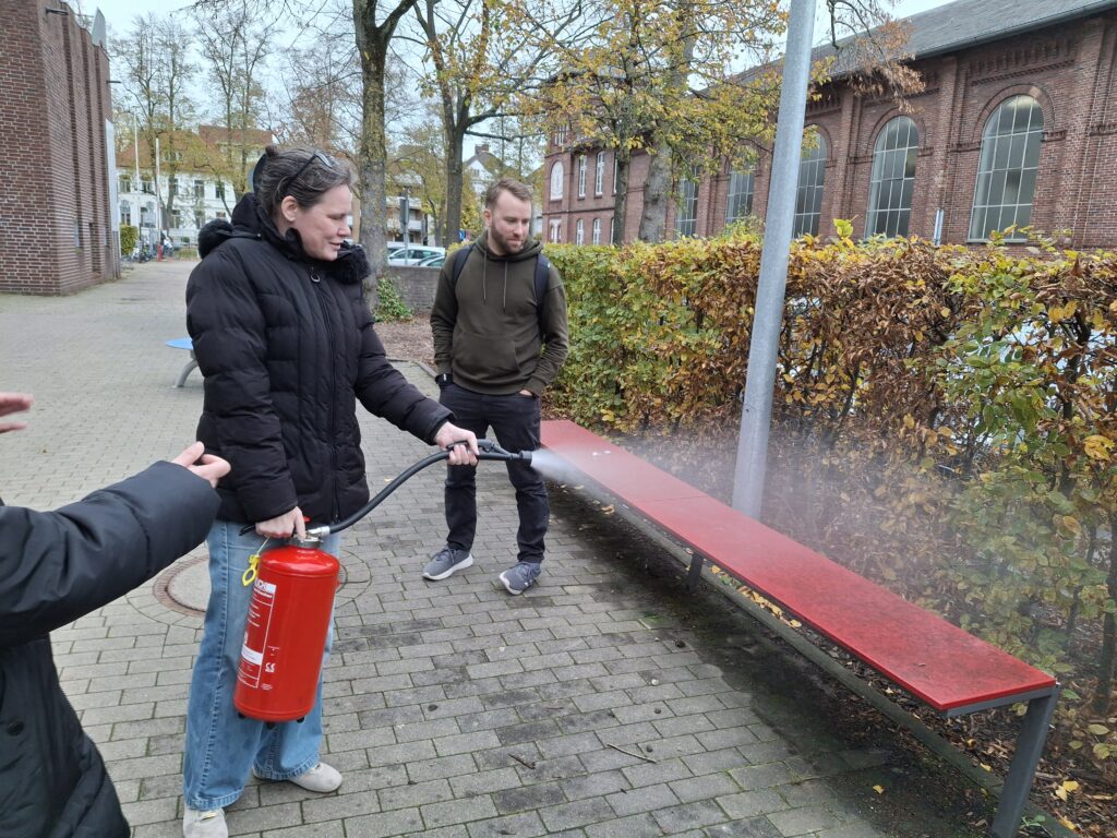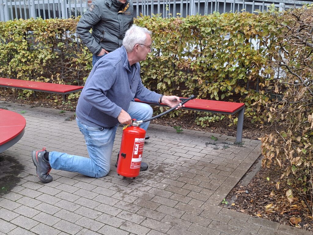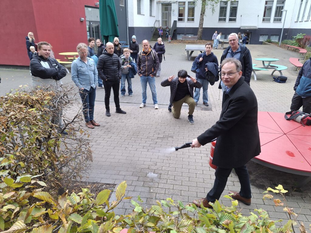 Wenn das Kollegium sich einzeln oder in Gruppen fortbildet, merken die Klassen und Kurse es manchmal durch inhaltliche Hinweise oder vielleicht auch eine Begeisterung für neue Methoden und Techniken. Aber in dieser Woche bekamen die Schülerinnen und Schüler mit Nachmittagsunterricht richtig was geboten, weil die praktischen Übungen zum Umgang mit Feuerlöschern (nicht nur für Lehrkräfte der Chemie!) im Innenhof stattfanden und sofort eine Schar von Schaulustigen anzogen. Am Ende waren alle „Feuer“ gelöscht und alle Beteiligten beruhigt, dass sie im Notfall immer noch wissen, was zu tun ist.