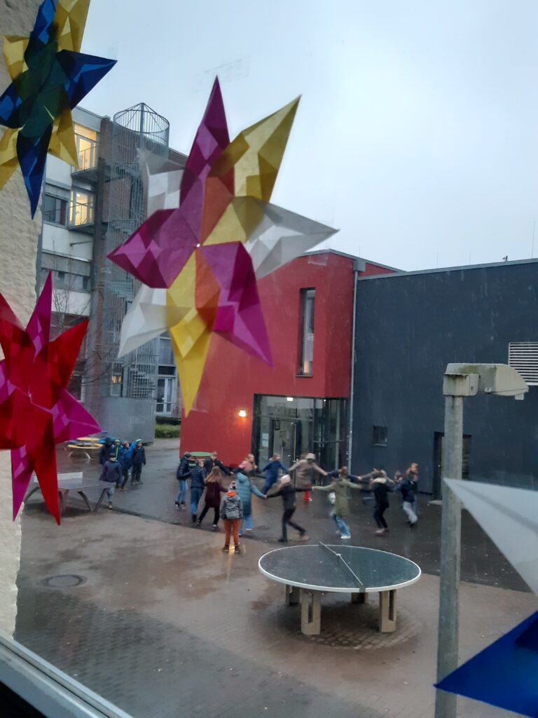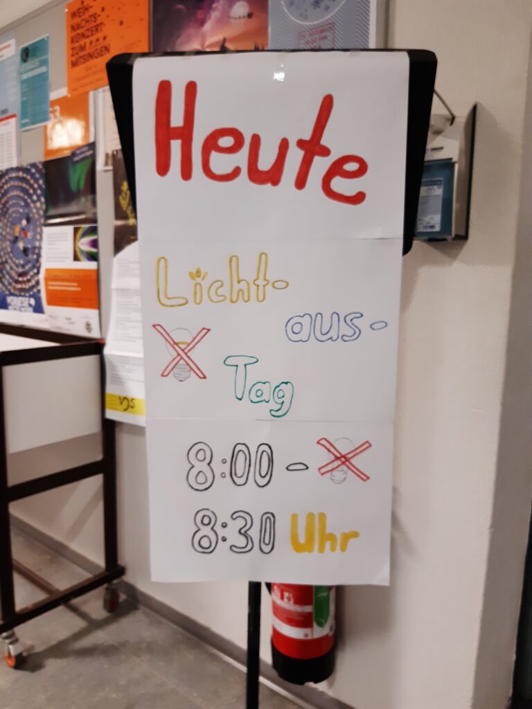 Der graue Schulalltag erfuhr heute in der ersten Stunde im Zusammenhang mit dem stadtweiten „Aktionstag für den Klimaschutz“ eine bei der Schülerschaft sicherlich willkommene Abwechslung. Bei Verzicht auf Licht und elektronische Medien war Raum zu Diskussionen rund um das Thema Energiesparen. Hierbei ist dann sicher dem einen oder anderen Mitglied der Schulgemeinschaft ein Licht aufgegangen… In einigen Klassen wurden dazu auch die ersten Weihnachtslieder gesungen (auswendig natürlich), andere trafen sich im Innenhof und übten einen Kreistanz. Die Möglichkeiten, auch einmal wieder ohne stromverbrauchende Geräte sinnvoll Zeit gemeinsam zu gestalten und zu lernen, waren ganz offensichtlich vielfältig.