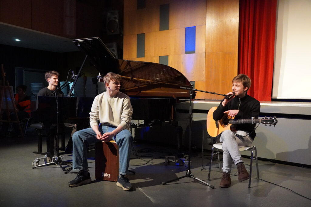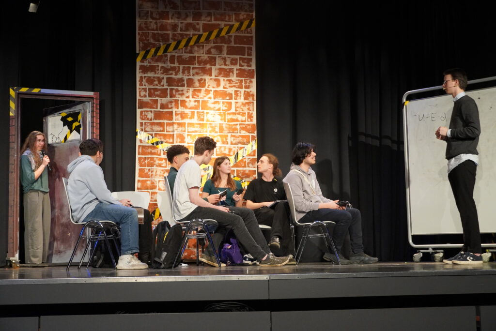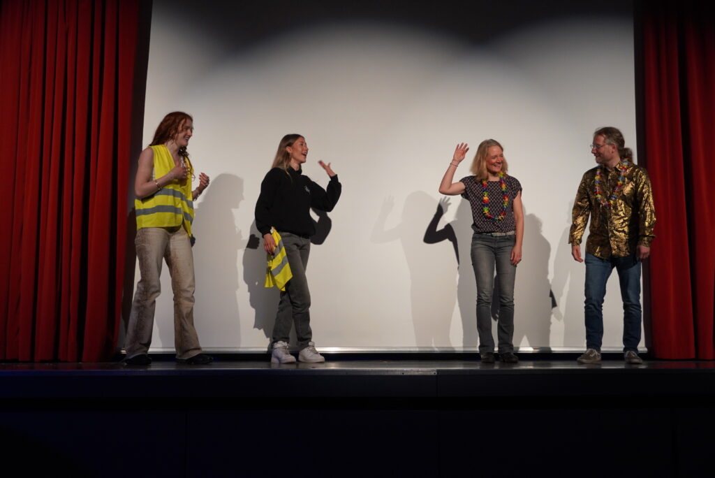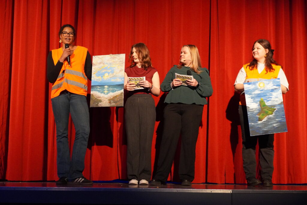 Lieder erkennen, geschichtliche Ereignisse einordnen, sportliche Aktivitäten wie Tanz, Lehrerinnen und Lehrer und die Schülerschaft – das mag zunächst nach einem normalen Schultag klingen, sind aber Programmpunkte aus dem und Beteiligte am Illustren Abend der Q2 am Freitagabend. Die Schülerinnen und Schüler präsentierten ein umfangreiches und breit gefächertes Programm mit zahlreichen Klassikern: Lehrerparodien, Lehrer-Schüler-Duelle und der Jahrgangstanz zum Abschluss. Hinzu kamen die Versteigerung von parallel zum Illustren Abend gemalten Bildern (vorgegebene Begriffe: Insel, Freiheit, Basketball), Musikeinlagen und eine Tanzeinlage mit Herrn Heise als special guest. Als besonders kniffelig erwies sich bei den Duell-Spielen die Zuordnung von Kinderbildern zu den angehenden Abiturientinnen und Abiturienten und der Lehrerschaft. Nicht nur die anwesenden Eltern in der vollbesetzten Aula dürften Gedanken durch den Kopf geschossen sein, wie schnell sich diese eben noch kleinen Kinder entwickelt haben und groß geworden sind…