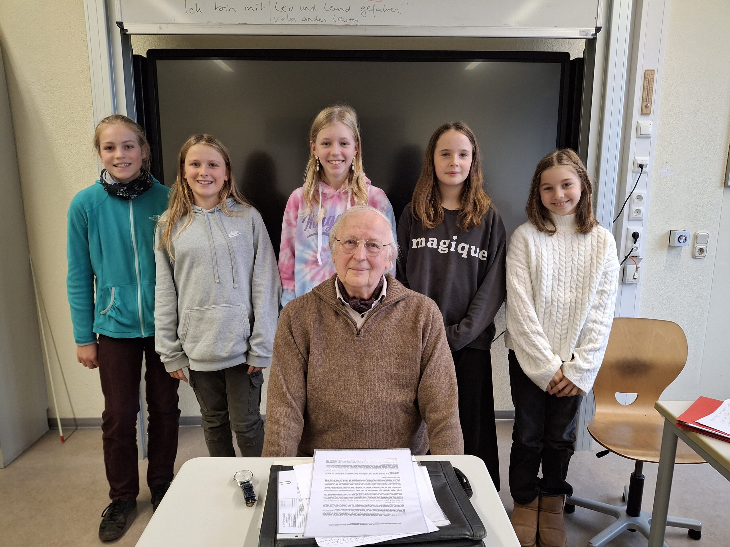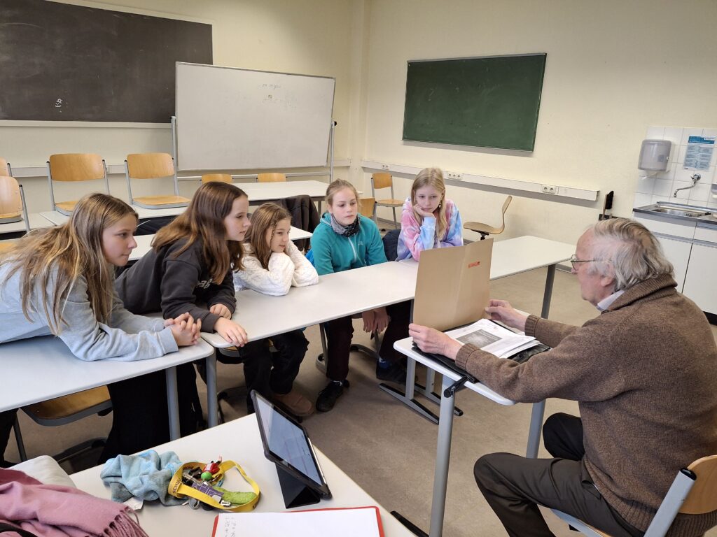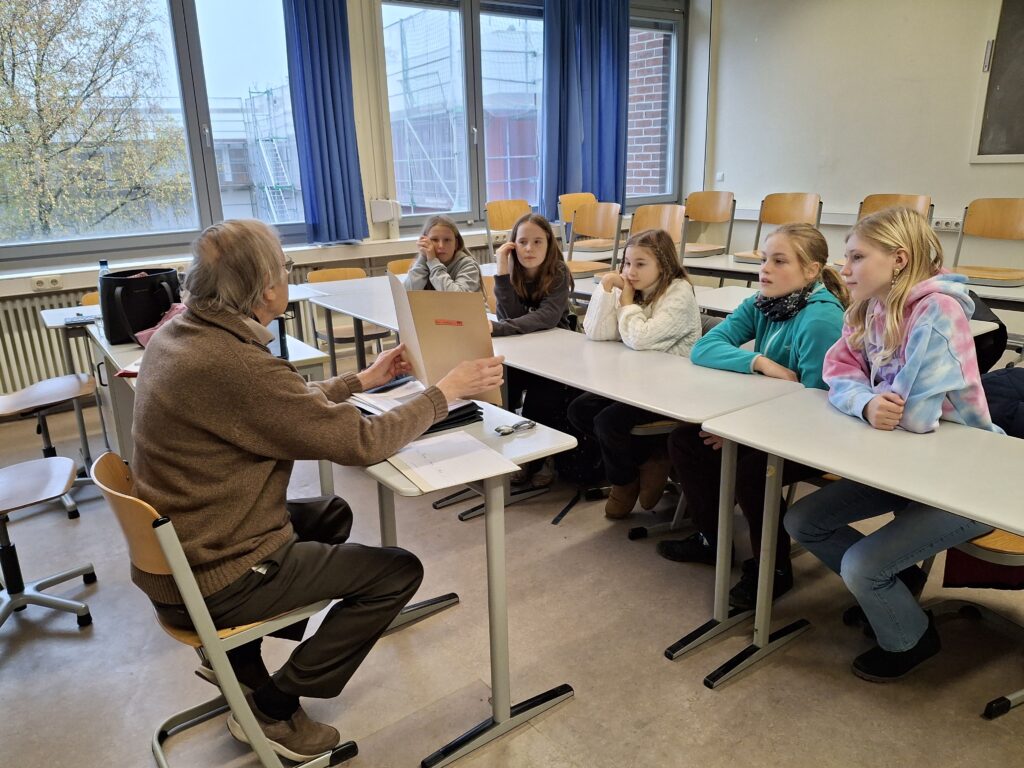 Am Donnerstag gab es einen besonderen Gast in der Cäci, denn mit Herrn Giera war der Vorgänger von Herrn Dr. Möller, von Frau Neddermeyer und von Herrn Held als Schulleiter im Haus. Und auch 23 Jahre nach seiner Pensionierung gab es noch Personen, die ihn in diesem Amt noch erlebt haben und damals z.B. Schülerin bzw. Schüler gewesen sind. Herr Giera war netterweise zu einem Interview mit der AG Schulgeschichte im Rahmen der Recherche für den Geschichtswettbewerb des Bundespräsidenten bereit. Er war nämlich nicht nur von 1982 bis 2001 Schulleiter der Cäci, sondern seit den 1970er Jahren bereits als Lehrer für Englisch und Geschichte bei uns tätig. Der Zeitraum, über den er den Mädchen der AG etwas erzählen konnte, ist also sehr groß. Auf jeden Fall hat die AG von dieser Zeitreise sehr profitiert und wird jetzt hochmotiviert weiterarbeiten.