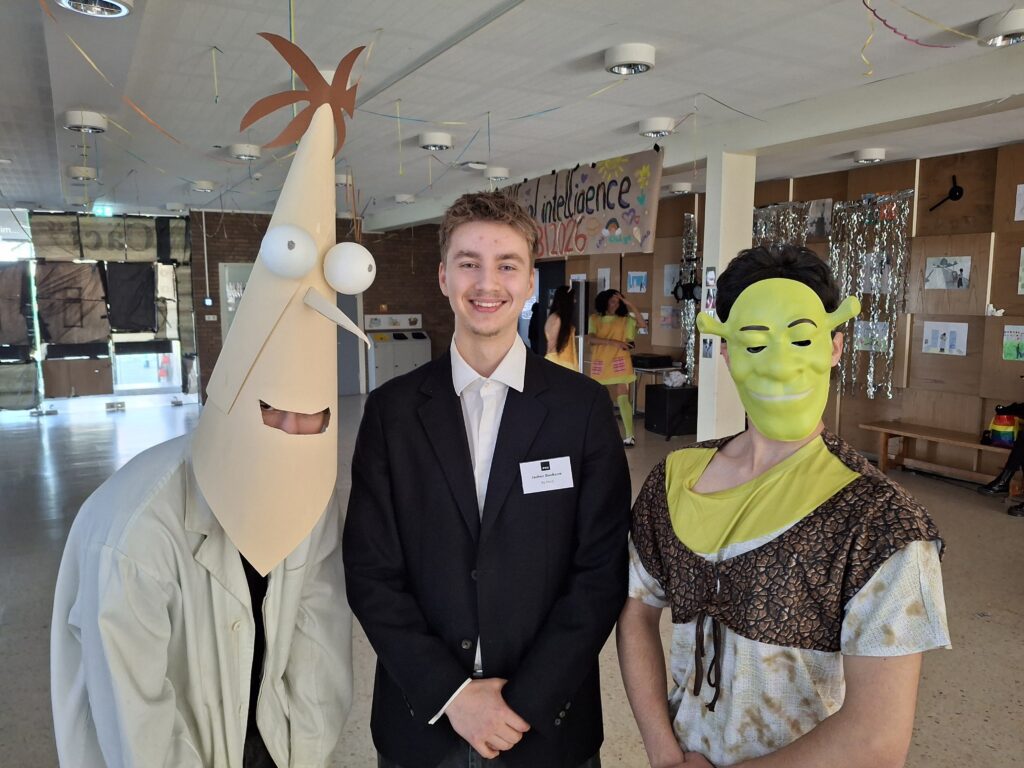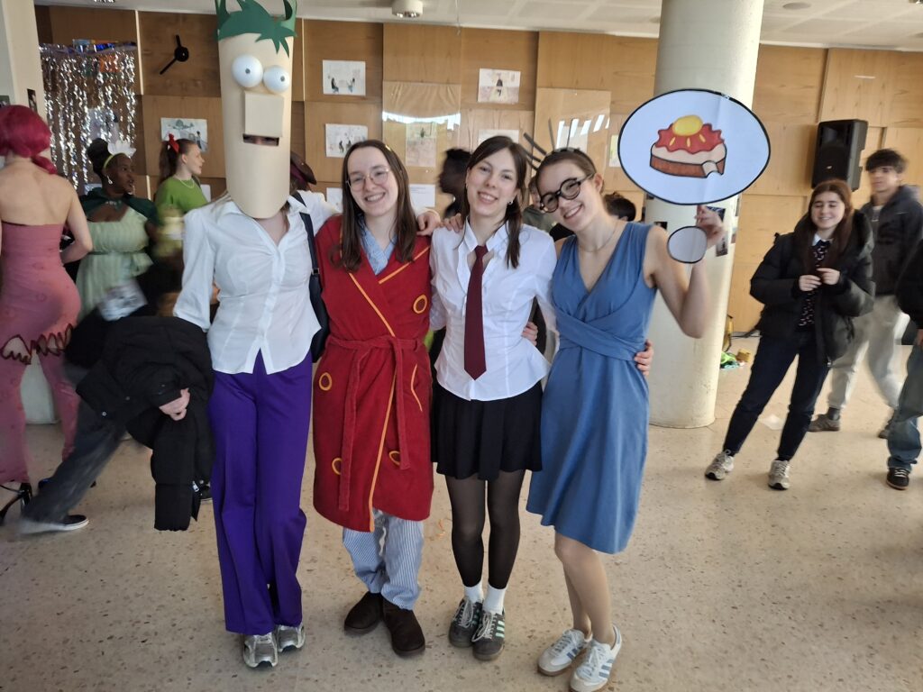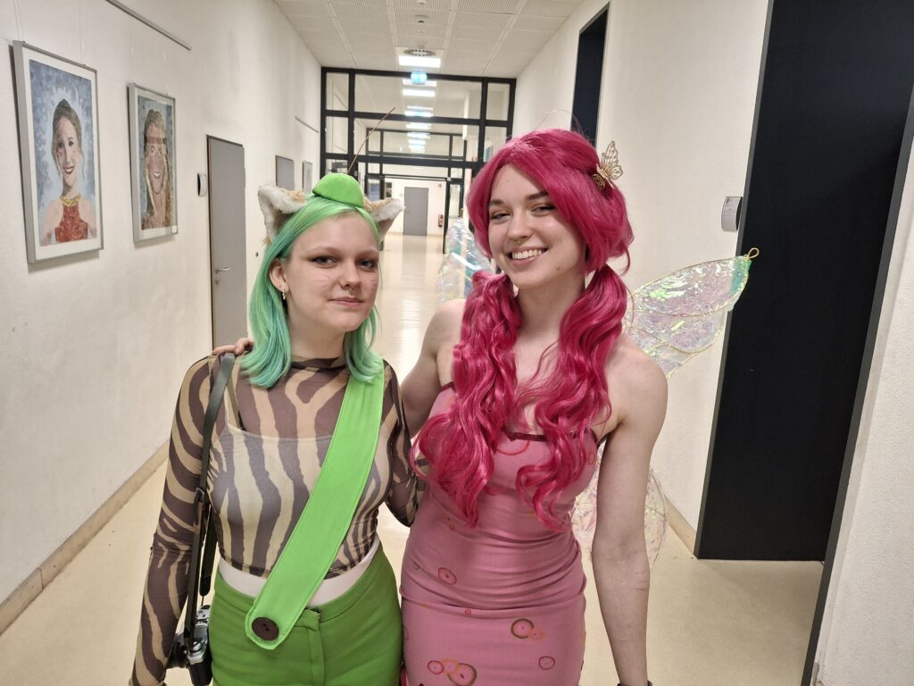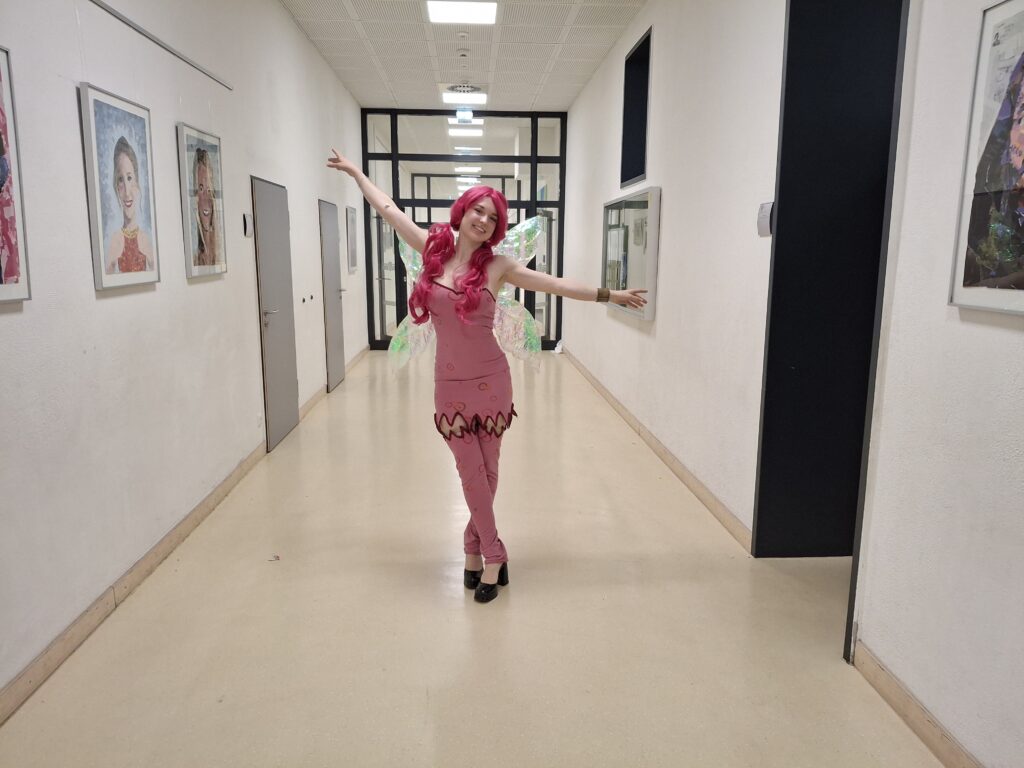 Beim Thema Kindheitshelden gibt die Q2 auch immer etwas von sich selber preis, allerdings darf man wohl nicht „Lieblingsfilm, als ich klein war“ mit „Vorbild, dem ich nachgeeifert habe“ gleichsetzen. So traf man auch in diesem Jahr beispielsweise Bibi und Tina, Hanni und Nanni, Mario (wo war eigentlich Luigi?), Paddington, Minions, Bob der Baumeister, Phineas und Ferb, Findus (ohne Pettersson), Elfen, das Sams, eine Cinderella im selbstgenähten (!) Kleid, Hermine, Pippi Langstrumpf oder Shrek im Foyer an. Bunt, fantasievoll, wunderschön, man wollte mit der Elfe zusammen den Gang entlangschweben. Und die Lehrkräfte fühlten sich bei dem Anblick vielleicht ein bisschen zurückversetzt in die Zeit, als diese mittlerweile Jugendlichen als kleine Fünftklässlerinnen und Fünftklässler durch die Flure getobt sind und ihre Helden auf T-Shirts und Pullis mit sich trugen.