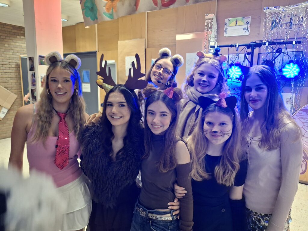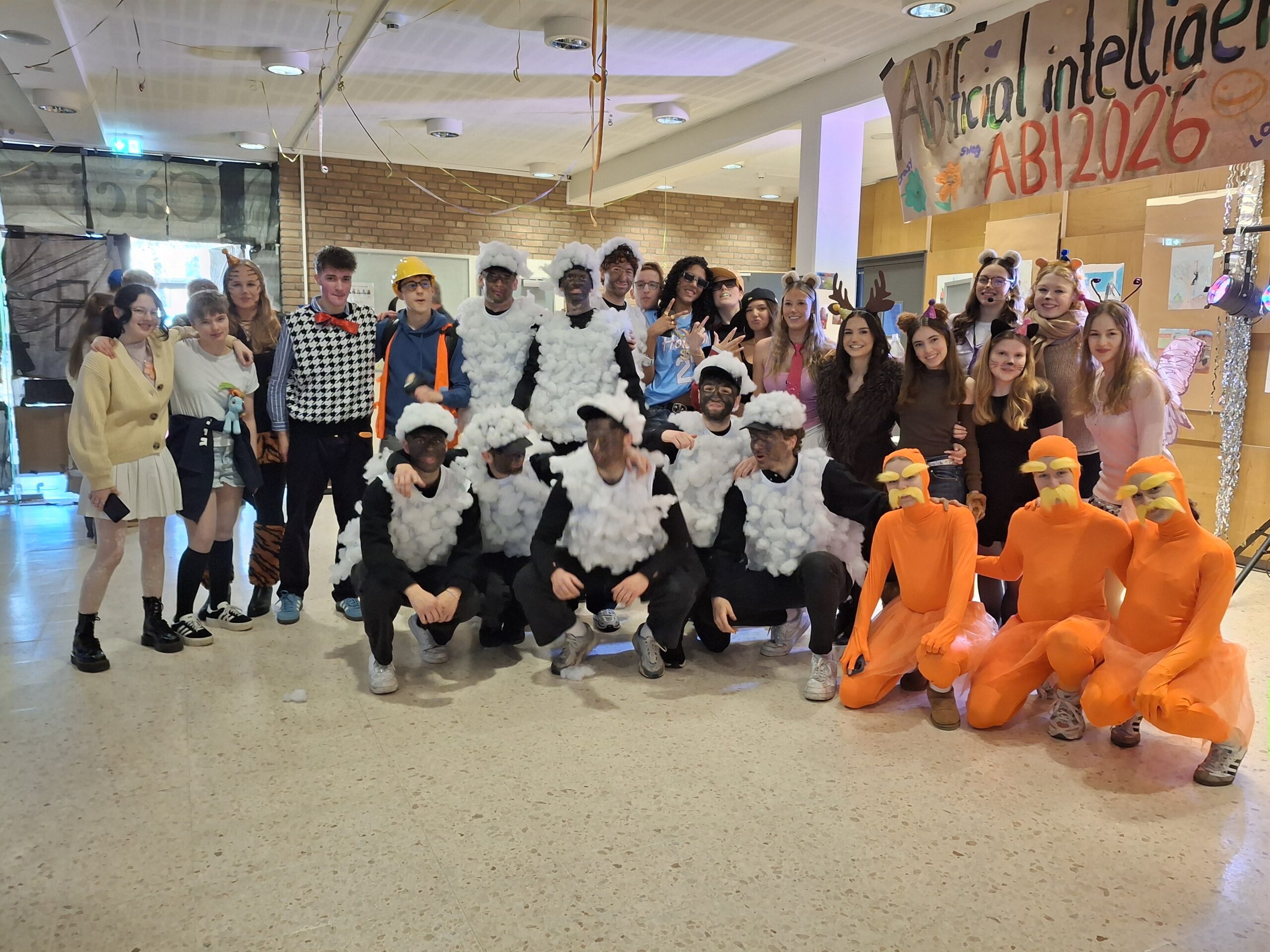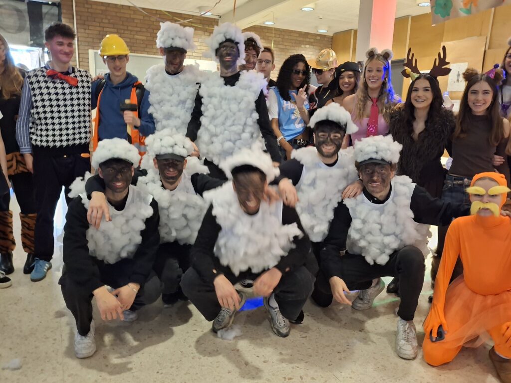 Tag 3 der Mottowoche unserer Q2, und heute war das Thema „Gruppen“, und so gab es im Haus Teams wie beispielsweise „Hogwarts“, „Waldtiere“, „Lorax“, „Baustelle“ und – ganz besonders gut zu erkennen (und angesichts der zahlreichen Wattebäuschen im ganzen Gebäude auch zu verfolgen!): das Team „Shaun das Schaf“. Ganz offensichtlich hatten alle wieder viel Spaß, und bei der Party im Foyer tanzten auch die jüngeren Jahrgänge mit!