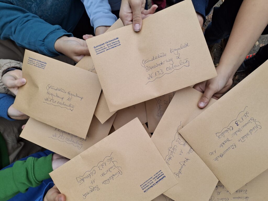 Im Deutschunterricht der Klasse 5 steht das Schreiben eines Briefes auf dem Lehrplan, und viele Klassen nutzen für diese Aufgabe in der Theorie die ehemaligen Klassenlehrkräfte der Schülerinnen und Schüler als Adressaten; „Stell dir vor, du schreibst deiner alten Klassenlehrerin einen Brief…“ Die 5b hat ihre Briefe an ihre insgesamt 19 Grundschulen (!) jetzt auch real abschickbereit gemacht und gestern auf den Weg gebracht. Ab heute trudeln also in Oldenburger Grundschulen (und nicht nur dort) sehr liebe Briefe ein. An dieser Stelle auch digitale Grüße an alle diese Schulen, von denen unsere Fünftklässlerinnen und Fünftklässler kommen!