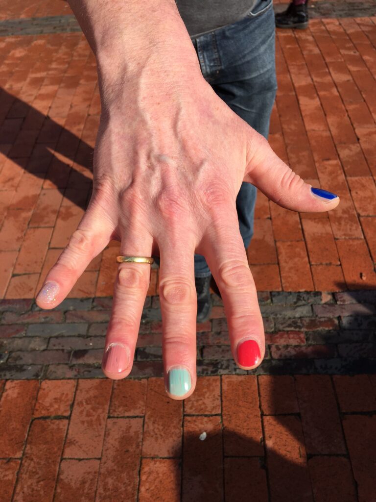 Bei herrlichem Frühlingswetter sind die beiden Musikensembles vom Mittwoch bis Donnerstag in die Jugendherberge nach Leer gefahren, um intensiv ihre Stücke für das Sommerkonzert zu proben. Unter der Leitung von Frau Inselmann, Frau Röller und Herrn Syfuß wurden nicht nur dabei große Fortschritte erzielt, sondern es gab auch eine Menge Spaß. Neben dem sehr guten Essen, dem heimlichen „Nachtprogramm“ auf den Zimmern und einer Nachtwanderung gab es vor allem wieder den bunten Abend mit Musik, Sketchen und Quizrunden. Dass der Abend im wahrsten Sinne des Wortes „bunt“ war, bekam ein Orchesterleiter, der hier nicht namentlich erwähnt werden möchte, am eigenen Leib zu spüren: Für jede falsch beantwortete Frage in einem Quiz-Duell mit Frau Röller wurde ihm ein Fingernagel lackiert – bis er sich am Ende geschlagen geben musste (s. Foto).