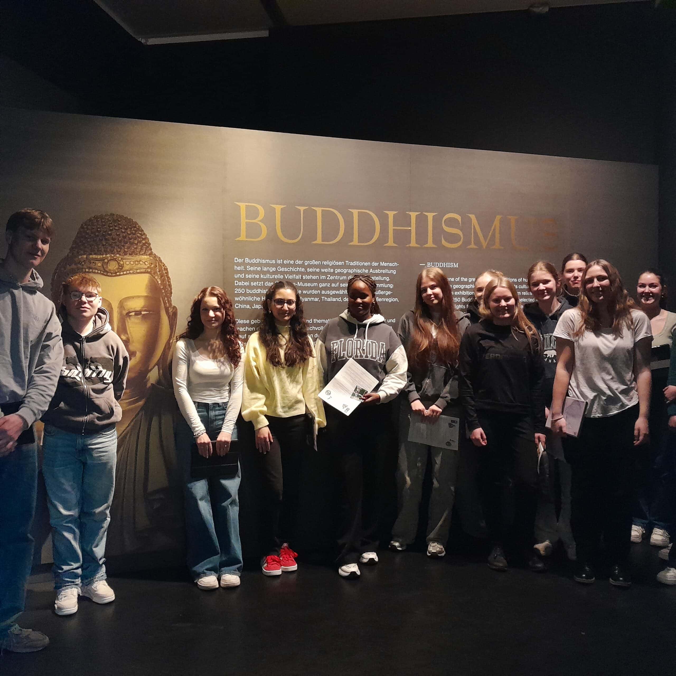 Es wird immer wieder behauptet, der Buddhismus sei eigentlich nur eine Philosophie, keine Religion. Der Buddhismus-Forscher Richard Gombrich hatte dazu Folgendes zu sagen: „Wenn ein Weg zur Erlösung nicht Religion ist, was dann?“ Dieser Frage konnte der Prüfungskurs Religion am 16.4. im Rahmen einer Exkursion in die Sonderausstellung „Buddhismus“ im Bremer Überseemuseum nachgehen und dabei in einer alle Sinne ansprechenden vielfältigen und bunten Ausstellung das Fachwissen über den Buddhismus theoretisch und praktisch vertiefen.