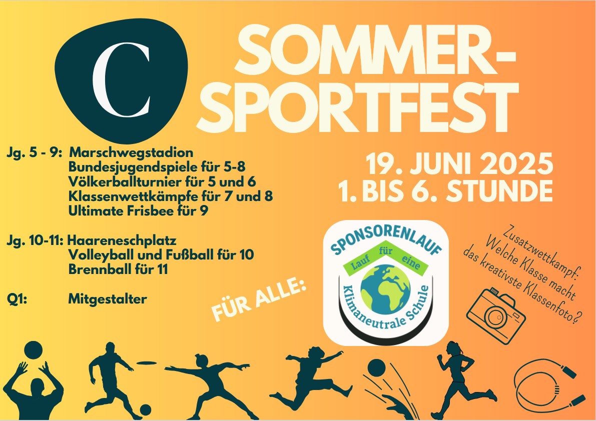 Am 19. Juni ist es wieder soweit: Wir tauschen die Klassenzimmer der Cäci mit den Sportstätten von Marschwegstadion und Haareneschwiese und feiern unser traditionelles Sportfest!