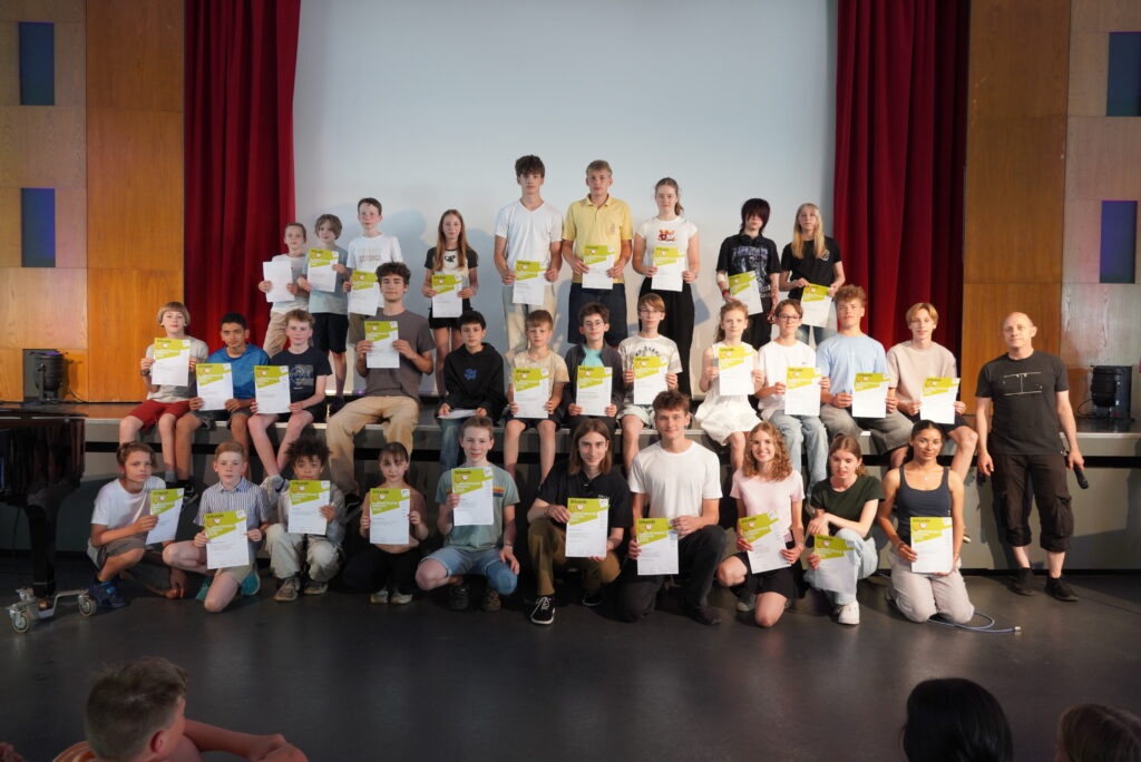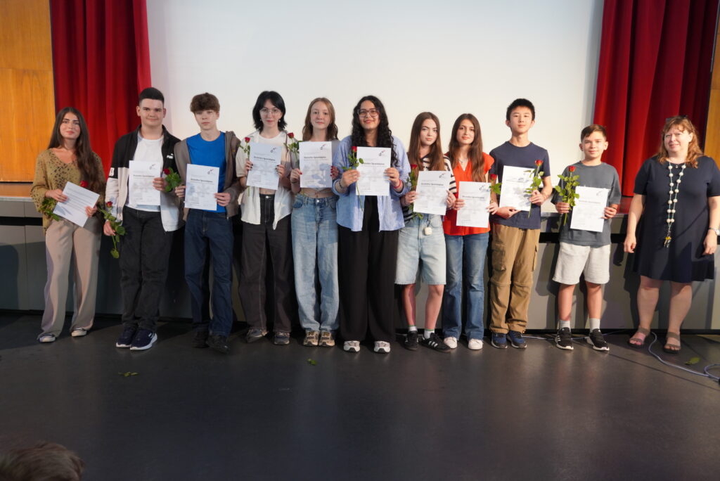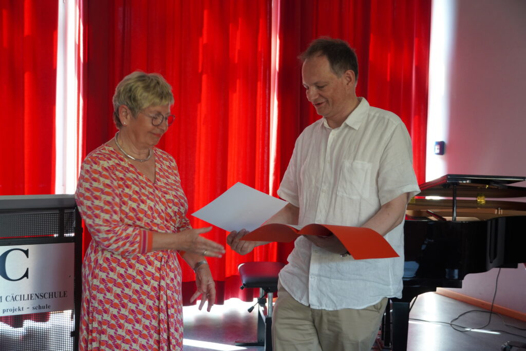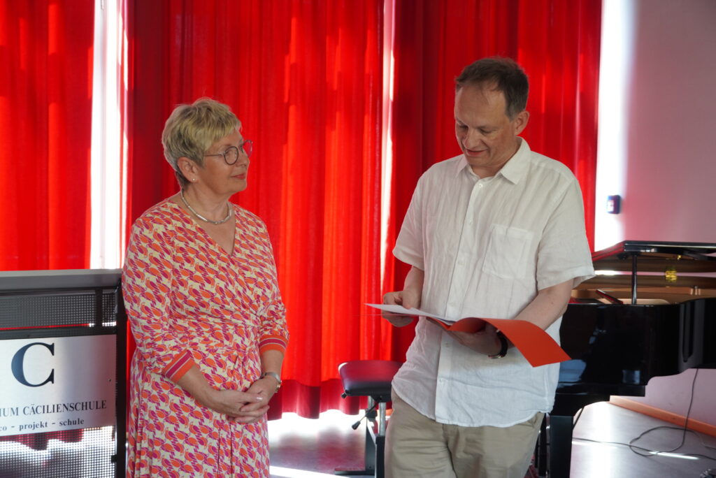 Letzter Schultag, Zeugnisausgabe, ab in die Sommerferien an einem glutheißen Tag. Doch dazwischen gibt es noch besondere Momente: in der ersten Stunde haben viele Klassen und Kurse zum Abschluss gefrühstückt und gespielt, in der Aulaveranstaltung in der 2. Stunde wurden Schülerinnen und Schüler für besondere Leistung geehrt (z.B. Deutsches Sprachdiplom, Känguru-Wettbewerb, Informatik-Wettbewerb, Jugend trainiert für Olympia und andere) und die verabschiedet, die die Cäci verlassen – wegen eines Schulwechsels in der Schülerschaft und bei den Lehrkräften diejenigen, die ihr Referendariat abschließen, ihre Vertretungstätigkeit endet oder ihr Bundesfreiwilligendienst – oder die Schulzeit insgesamt. So haben wir Frau Schenk-Tillmann in den wohlverdienten Ruhestand verabschiedet. Allen Scheidenden wünschen wir alles erdenklich Gute für ihre Zukunft, und wir freuen uns auf ein Wiedersehen!