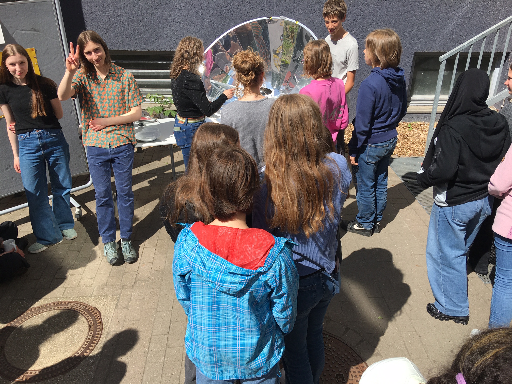„Nur noch zwei Stück übrig!“, zeigt Rasmus C. mit eindeutiger Geste an. Tatsächlich fanden die Solar-Falafel bei der am Donnerstag von der Energie-AG durchgeführten Aktion reißenden Absatz. Trotz des kalten Nordwindes heizte die Sonne die Pfanne im Zentrum des großen Solarspiegels so sehr auf, dass der eine oder andere Abnehmer, der von der Seite her stibitzen wollte, sich im Brennpunkt schnell mal die Finger verbrannte… Eine gelungene Aktion, die an das Potenzial von alternativen Energieformen erinnern soll.