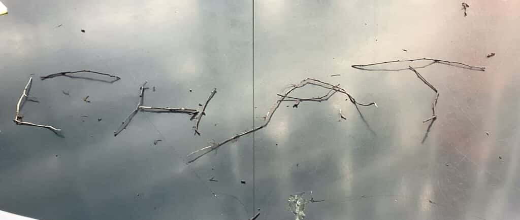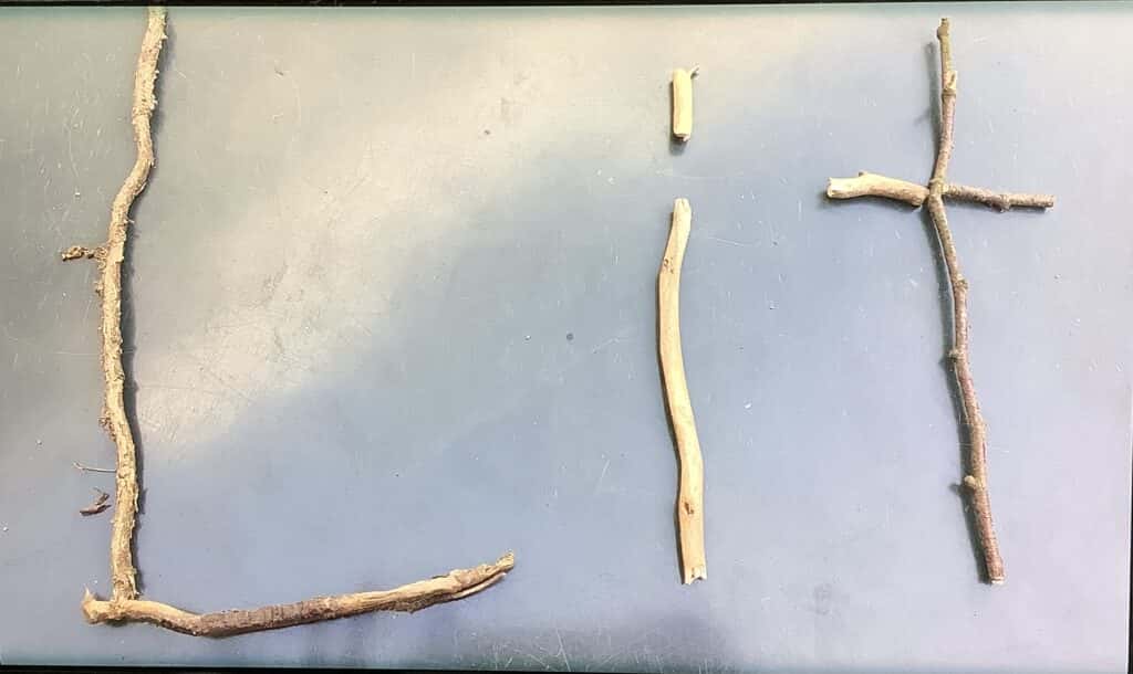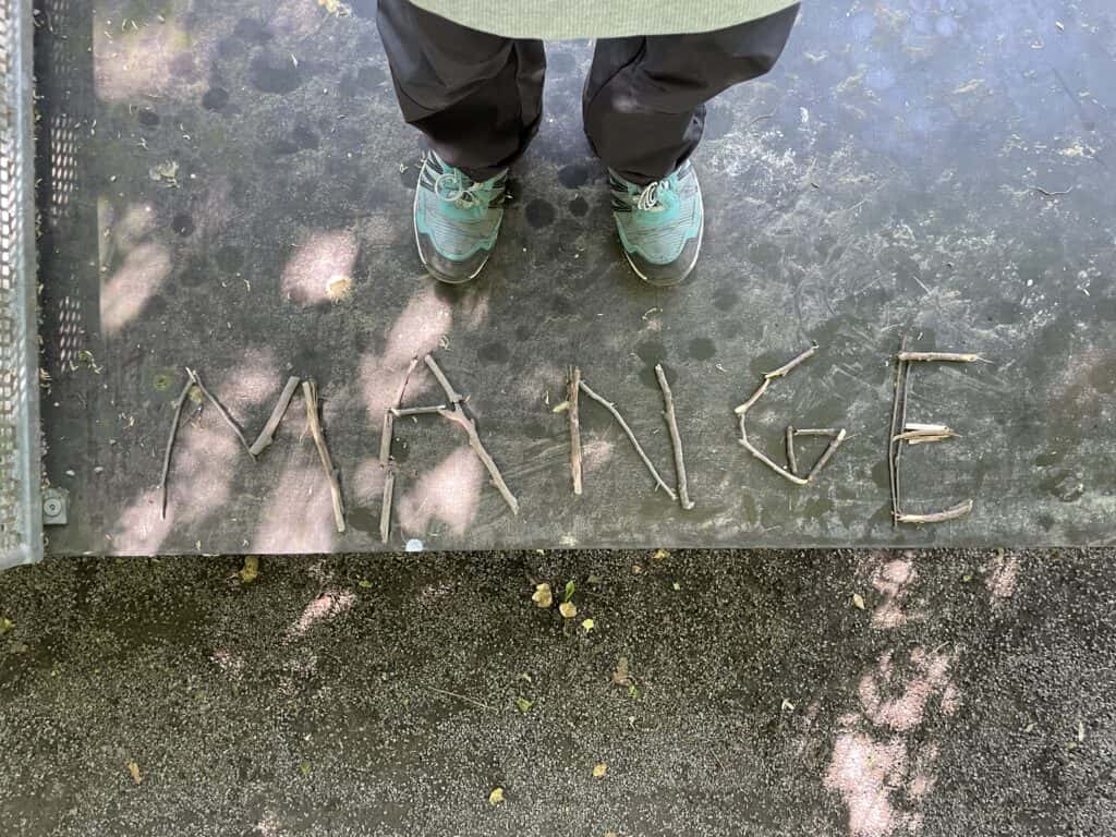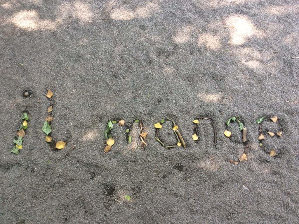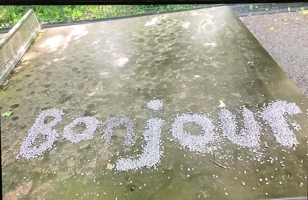 Nein, das ist kein vergessener Spicker aus dem Französisch-Abitur! Hier hat eine Klasse mit Frau Burchards die Zeit nach der Französisch-Klassenarbeit dazu genutzt, aus Naturmaterialien französische Begriffe zu legen, quasi als (nachhaltigen) Spicker bzw. Test und vielleicht sogar Aufforderung für und an alle Dobbenhofbesucher. Also – Herausforderung annehmen: Versteht ihr, was dort steht?