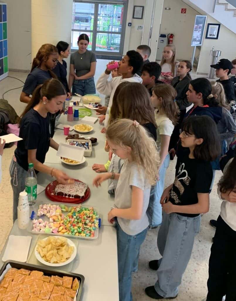 Ein Jahr lang waren die Vertrauensschülerinnen und -schüler bei den Klassen 5, haben „die Kleinen“ mit in Empfang genommen , sie auf Kennenlernfahrten begleitet, Kekse gebacken und vieles mehr. Vor allem standen sie den Jüngeren immer mit Rat und Tat zur Seite, damit diese gut in unserer Cäci ankommen. Zum Abschluss dieser Zeit organisierten sie eine Party für „ihre Fünften“. Im Foyer luden sie zu Kuchen, Waffeln und Getränken ein, und in der Aula wurde getanzt und gespielt. Etwa 80 Fünftklässlerinnen und Fünftklässler hatten Spaß an Stopptanz, Reise nach Jerusalem und Karaoke und begaben sich damit auf die Schuljahresendzielgerade. Im nächsten Schuljahr sind unsere „Kleinen“ dann schon längst keine Neuankömmlinge mehr, sondern quasi schon „alte Hasen“.