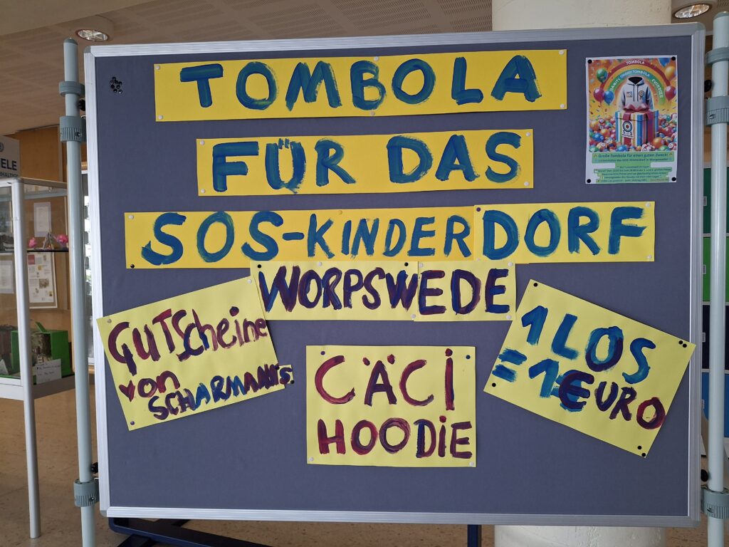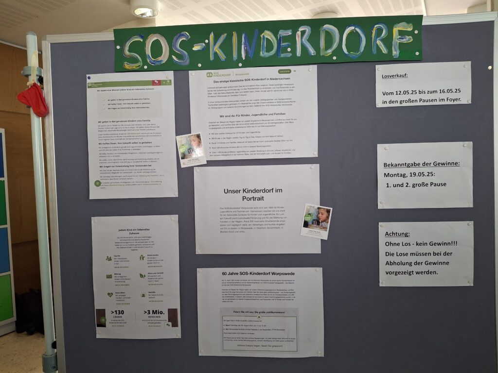 Für einen wirklich guten Zweck engagiert sich die Klasse 5a, und die ganze Schulgemeinschaft kann dabei und gleichzeitig Nutznießer sein: Das SOS Kinderdorf in Worpswede ist eins von über 567 Kinderdörfern in über 130 Ländern weltweit und das einzige im norddeutschen Raum. Unterstützt die Kinder in Worpswede – tut etwas Gutes und gewinnt gleichzeitig tolle Preise!