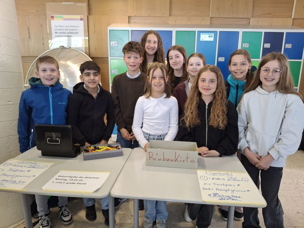 Von Montag bis Freitag sind die Schülerinnen und Schüler aus der Klasse 5a in den großen Pausen im Foyer für euch da. Weitere Informationen entnehmt ihr den Informationen auf den Stellwänden. P.S.: Neben dem Loserwerb darf auch gerne gespendet werden.