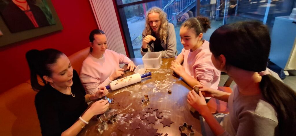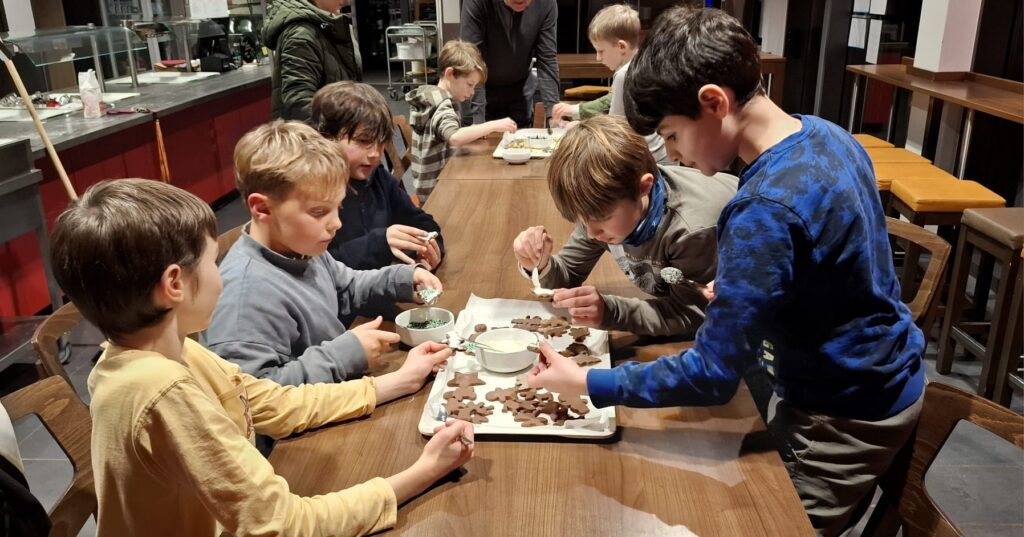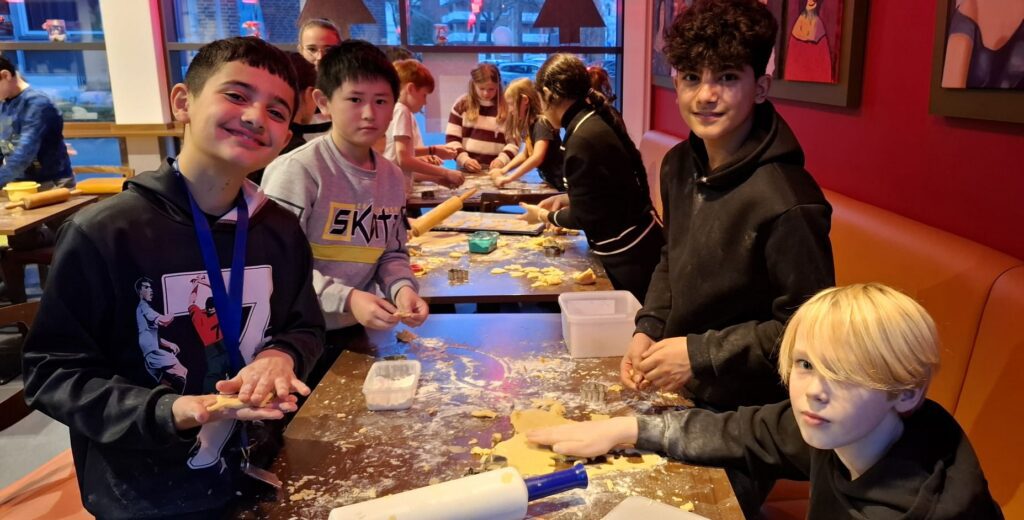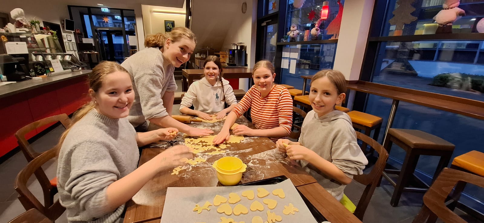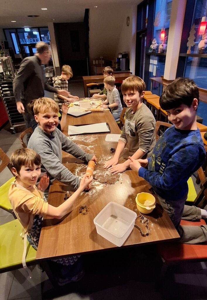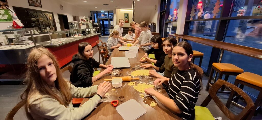 Auf gar keinen Fall! Die Begeisterung für die adventlich-winterlichen Backnachmittage in der Cäciteria beschränkt sich wahrlich nicht nur auf die Jahrgänge 5 und 6, sondern geht hoch bis…. – nun, man soll dort auch schon Oberstufenkurse gesehen, die eine gute Zeit hatten! Auf jeden Fall ist diese schöne Tradition der Backsaison offiziell eröffnet, so dass jetzt nicht nur morgens um 7 ein warmes Licht aus der Mensa in den Innenhof fällt, sondern auch am Spätnachmittag. Herzlichen Dank an Petra!