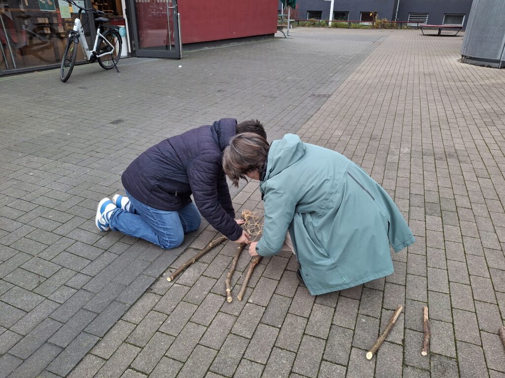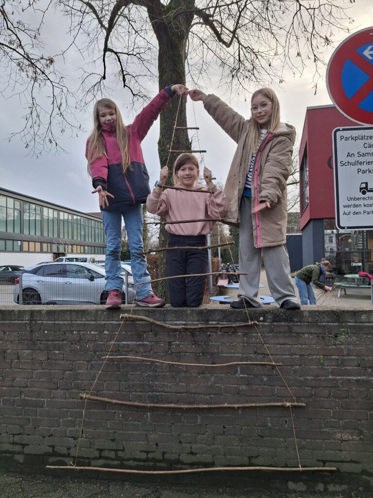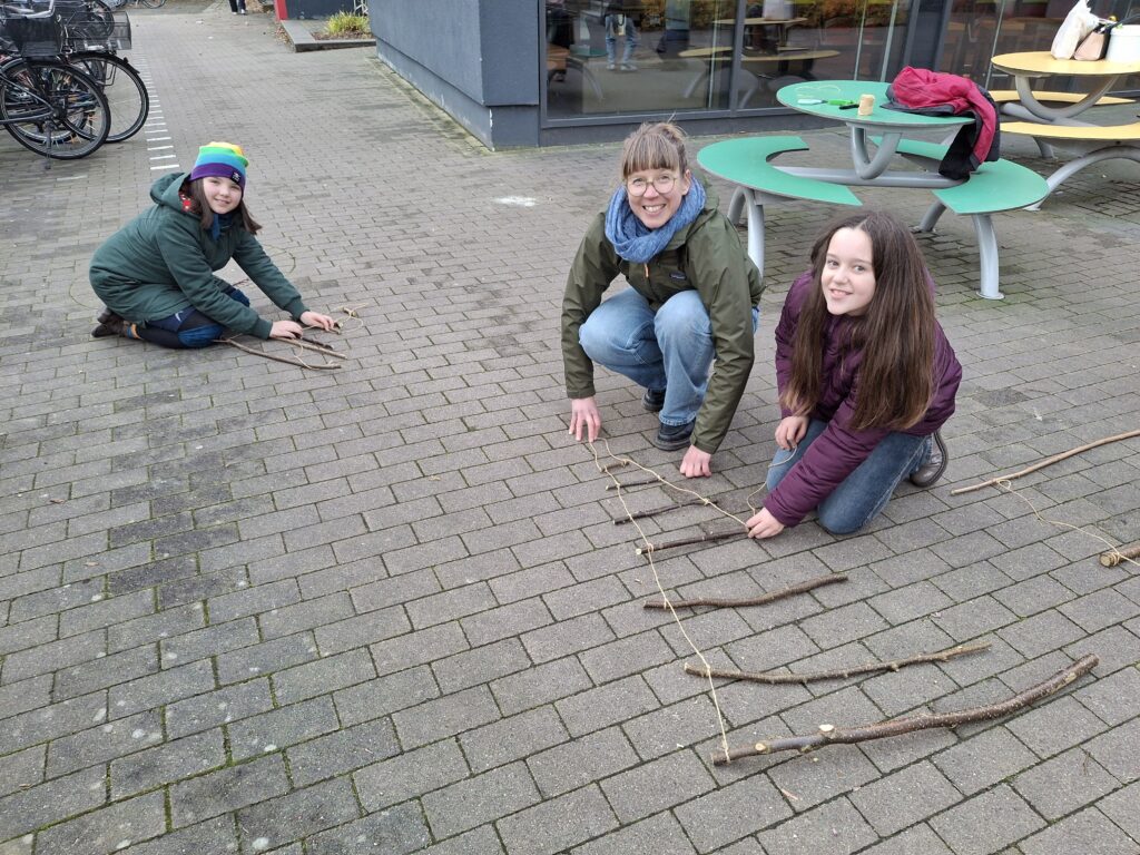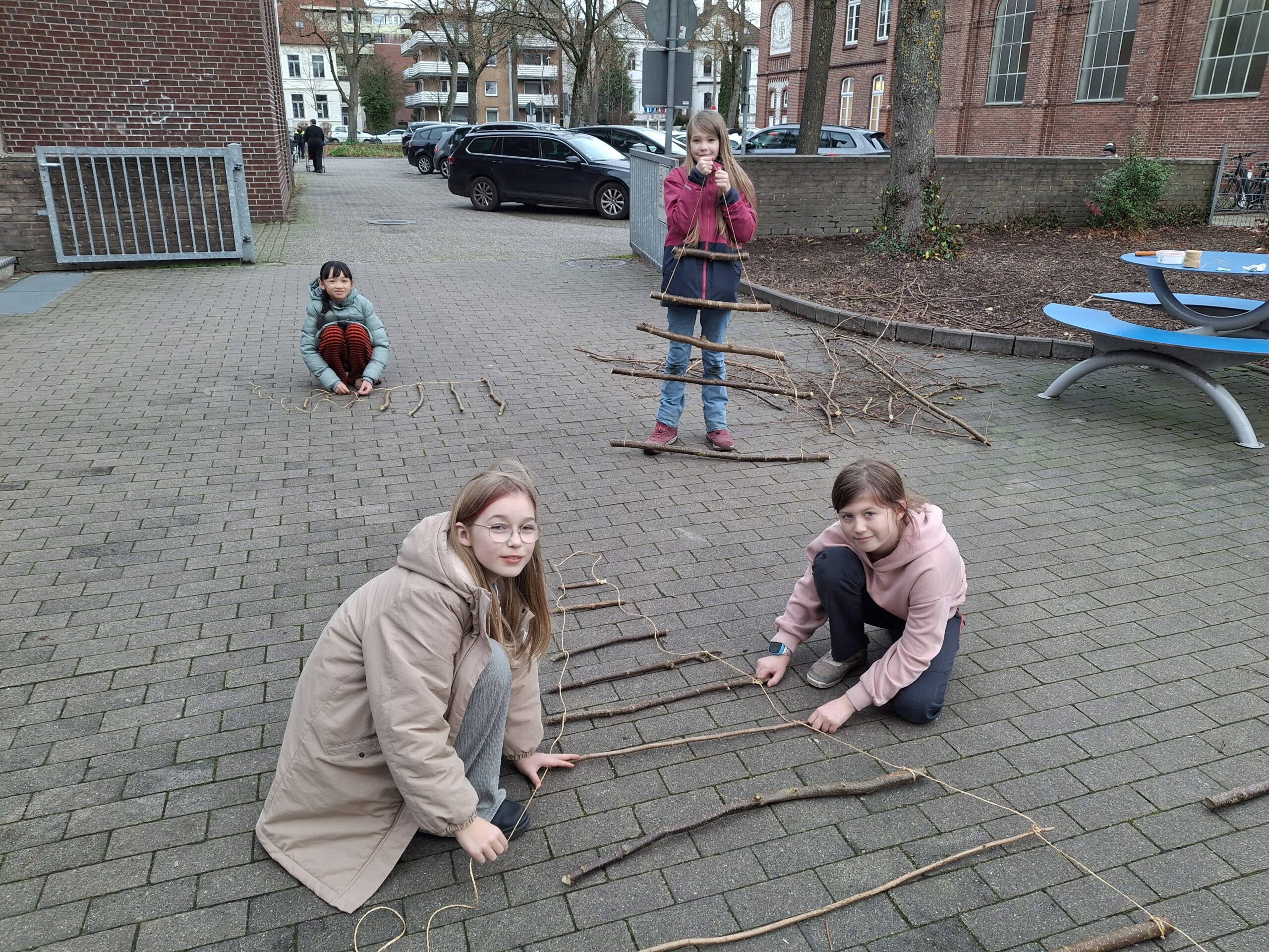 Die earth action!-AG hat sich passend zur Festzeit Gedanken über alternative Formen von Weihnachtsbäumen gemacht. Ja, das ist eine ganze Industrie, aber das heißt noch lange nicht, dass jeder in jedem Jahr einen Baum für sich fällen (lassen) will oder gar auf einen Kunststoffbaum umstellen möchte, auch wenn der wiederverwendtbar wäre. Die Gruppe mit Frau Dr. Gralher-Krengel und Frau Tellechea kam auf eine ganz andere Idee: Die Schülerinnen und Schüler bauten aus Schnittholz, das sowieso angefallen ist, und Schnur eine Art Gestell in Baumform, das jetzt noch darauf wartet, mit Kugeln und Kerzen verziert zu werden! Der „Rohling“ ist dabei so groß, dass er mit den handelsüblichen Tannenbäumen gut mithalten kann, siehe Bildbeweis! Bitte schickt uns Bilder von den geschmückten Endergebnissen!