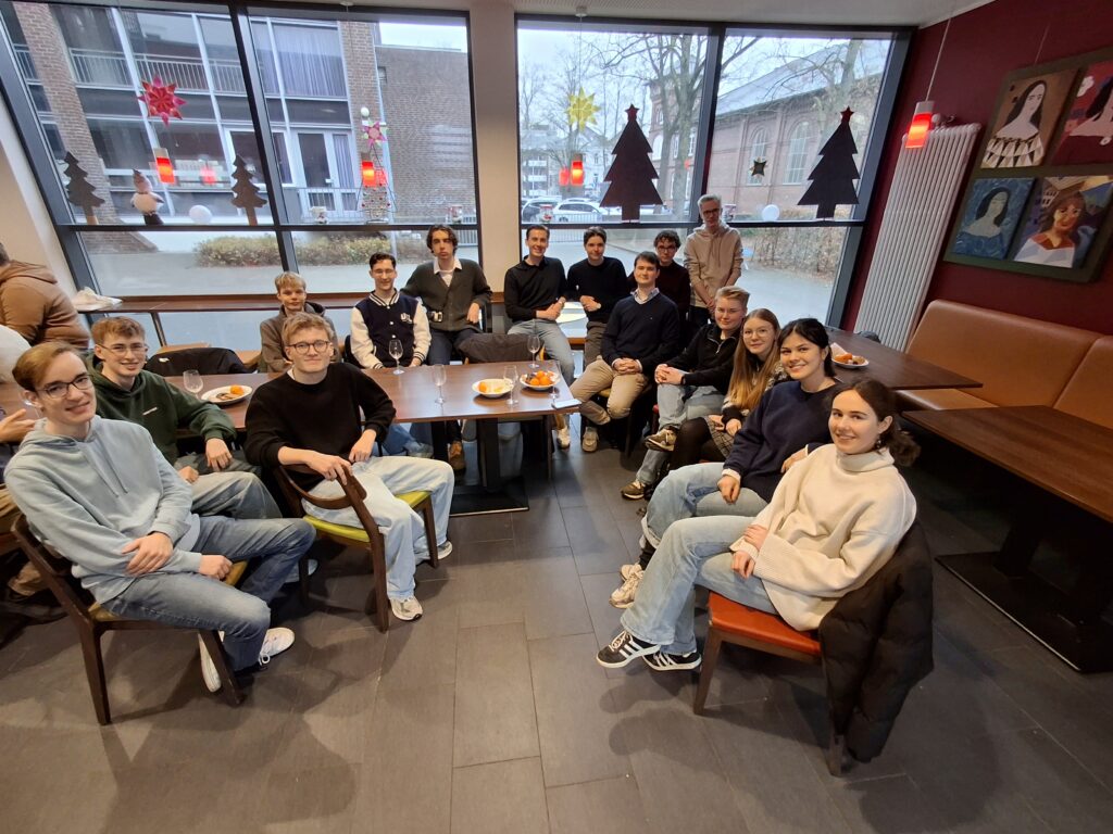 Am dritten Feiertag fand das traditionelle Ehemaligentreffen in der Cäciteria statt, und zahlreiche unserer Ehemaligen sind der Einladung gefolgt! In diesem Jahr waren die jüngeren Abiturjahrgänge stärker vertreten (besonders der Abijahrgang 2024), aber die Spannweite reichte über 30 Jahre bis zum Abijahrgang 1993. Und auch verschiedene Lehrkräfte nutzten die Gelegenheit für ein Wiedersehen und ein Update, was aus den Kindern und Jugendlichen geworden ist, die sie teilweise seit ihrem 10. Lebensjahr kennen, und führten gerne mehrere Gruppe durch das Schulgebäude, in dem sich auch seit dem Sommer 2024 bereits wieder viel getan hat: Die Container auf dem Dobbenhof sind abgebaut und der zweite Stock ist freigegeben, so dass man endlich auf kurzem Wege vom Verwaltungstrakt bis zum alten Kunstraum 32 gelangen kann, in dem so einige Ehemalige ihre Abiturklausuren geschrieben haben.