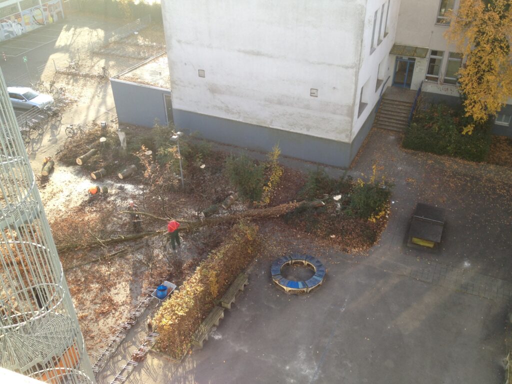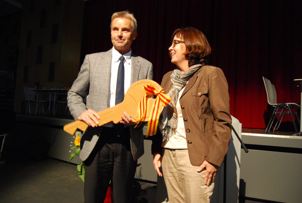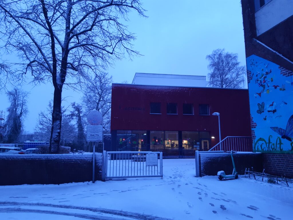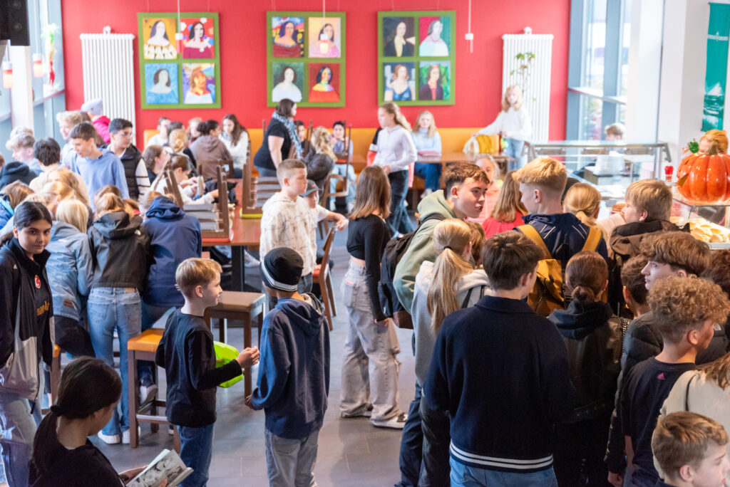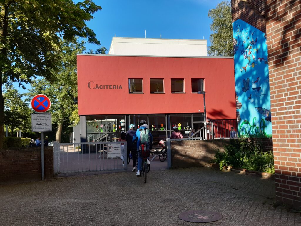 Wenn sich die Cäci im Innenhof versammelt und applaudiert und klatscht, dann muss schon etwas Besonderes passiert sein, aber bei zehn Jahren Cäciteria unter der Leitung von Petra und ihrem Team ist das ja wohl der Fall. Und so kamen gefühlt auch alle 1000 Schülerinnen und Schüler und 100 Lehrkräfte und das Mitarbeiterteam in der zweiten großen Pause zur Cäciteria, um Petra und ihrem Team zu danken und sie mit Blumenstrauß und ganz besonders großer Gratulationskarte zu feiern. Vielen Dank für euren Beitrag zu unserem Schulgeist!