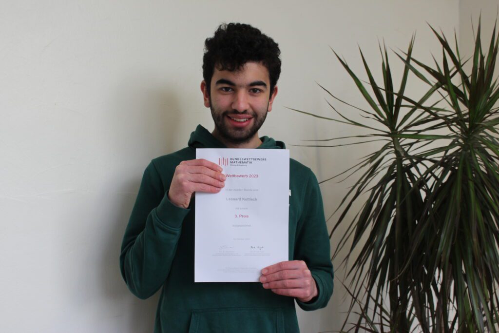 Das Kalenderjahr geht nicht zu Ende ohne die Ehrungen für besonders erfolgreiche Schülerinnen und Schüler – in diesem Falle im Bereich Mathematik. Wir gratulieren Leonard Kottisch aus der Q1 für seinen 3. Platz beim Bundeswettbewerb Mathematik, die Urkunde durfte er bereits am Dienstag in Bielefeld entgegennehmen. Auch bei der Mathematik-Olympiade war Leonard erfolgreich – genauso wie Felicia Wetzel, Nyla Beske, Christian Hurka und Jakob Suhren, die Herr Hillmann in der Mathe-AG betreut. Allen herzlichen Glückwunsch zu diesen beeindruckenden Erfolgen und weiterhin Freude an der Mathematik!